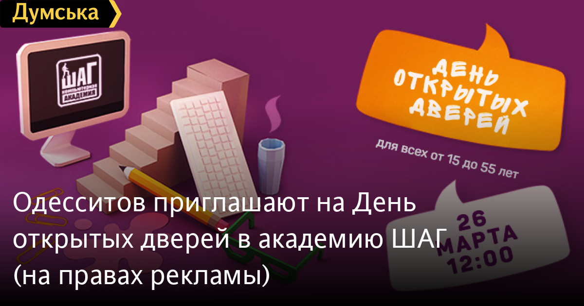 Одесситов приглашают на День открытых дверей в академию ШАГ (на правах рекламы)26 марта в Компьютерной академии ШАГ (ул.Еврейская, 3) пройдет день открытых дверей. Все желающие могут посетить День открытых дверей и узнать все о направлениях, по которым проводится обучение в академии: • разработка программного обеспечения Гостей ждет увлекательная презентация курса практикующими специалистами академии, экскурсия по комфортным современным аудиториям, а также возможность подробно ознакомиться с программой обучения и получить квалифицированную консультацию. Также в программе: • 7 самых востребованных профессий будущего. Начнется День открытых дверей в 12:00 26 марта по адресу: улица Еврейская, 3. Регистрация по ссылке обязательна — http://goo.gl/WOUcSu СМЕРТЬ РОССИЙСКИМ ОККУПАНТАМ! Заметили ошибку? Выделяйте слова с ошибкой и нажимайте control-enter |