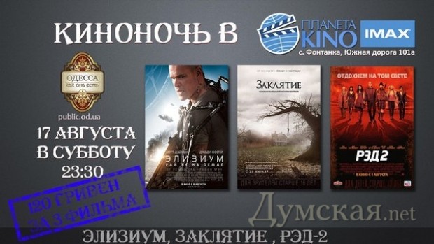 Одесситам предлагают посмотреть сразу три кино-новинки в течении одной ночи. В ночь с 17 на 18 августа в кинотеатре «Планета Кино» пройдет показ фантастического фильма «Элизиум», ужастика «Заклятие 2« и боевика «РЭД -2». Желающим предлагают зарегистрироваться тут.