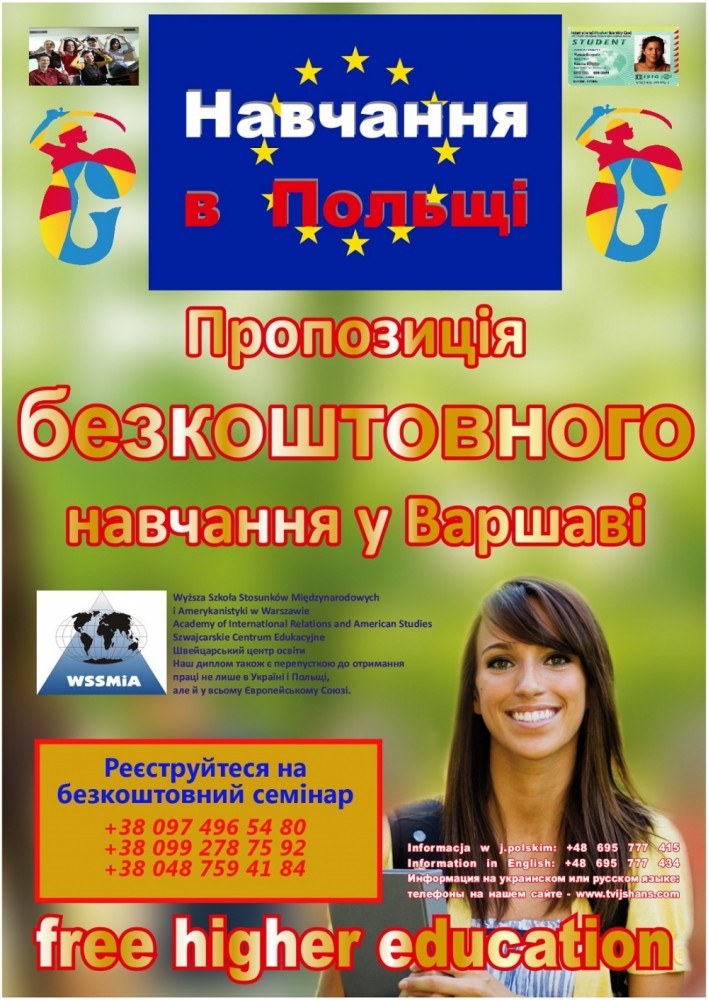 С 29 мая по 1 сентября в Одессе будут проходить семинары о возможности бесплатного образования в Польше. «Образование в Польше – это не только возможность получить диплом, признанный в Украине и Европейском Союзе, но и возможность устроится на престижную работу. Выпускники известных польских вузов могут работать в Украине, Польше и Европейском Союзе. Во время обучения студент выучит не только польский язык, но и английский либо немецкий. Благодаря студенческим офисам карьеры, которые функционируют в учебных заведениях, можно стажироваться во время обучения в польских предприятиях и принять участие в европейских студенческих обменах. Без вступительных экзаменов и ВНО», — отметили организаторы семинаров. Семинар будет включать в себя несколько блоков: бесплатное образование в Польше; образование в ведущих вузах Польши; 4-дневный выезд в Польшу для ознакомления с предложениями лучших польских вузов; дистанционное образование в Польше. Семинар организовывает фирма KRIM.PL , расположенная в городе Петркув-Трибунальский (Польша). Зарегистрироваться для участия в семинаре можно по телефонам: + 380 97 496 54 80, +38048 795 41 84, +380 99 278 75 92. www.tvijshans.com, www.ukr-pol.eu, www.praktycznestudia.pl, www.niedaleko.com СМЕРТЬ РОСІЙСЬКИМ ОКУПАНТАМ! Помітили помилку? Виділяйте слова з помилкою та натискайте control-enter |