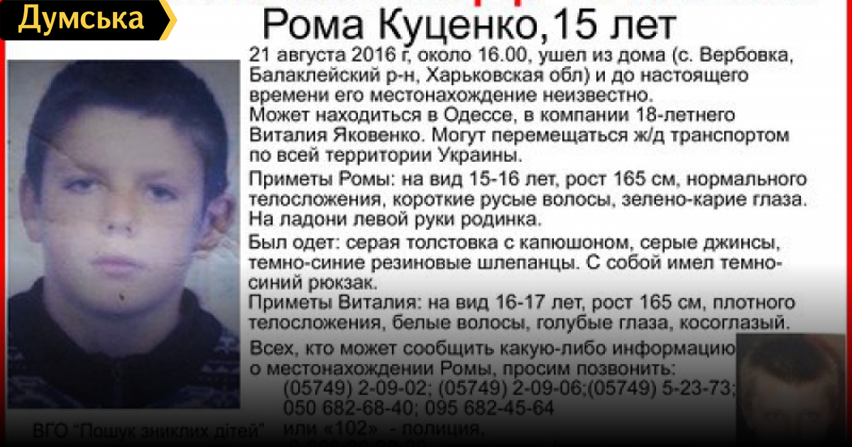 По словам близких, мальчик может находиться в Одессе в компании 18-летнего Виталия Яковенко.