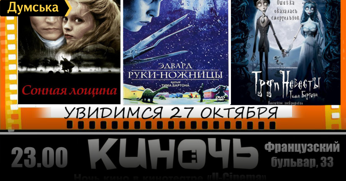 В кинотеатре «U-Cinema» в ближайшую субботу снова пройдет киноночь. Мероприятие проводится пабликом «Одесса как она есть». Как сообщают организаторы, зрители увидят ночь фильмов американского режиссера и мультипликатора Тима Бёртона (Сонная лощина, Эдвард руки-ножницы, Труп невесты). Цена билета составляет 60 гривен. Начало киноночи – 27 октября в 23:00. Забронировать билет можно здесь. Фильмы демонстрируются на русском языке. СМЕРТЬ РОСІЙСЬКИМ ОКУПАНТАМ! Помітили помилку? Виділяйте слова з помилкою та натискайте control-enter |