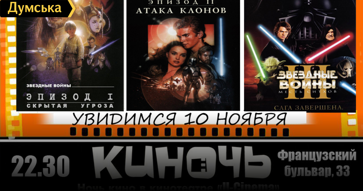 Мероприятие проводится пабликом «Одесса как она есть». Как сообщают организаторы, зрители увидят фильм Звездные войны (эпизоды 1, 2 и 3).