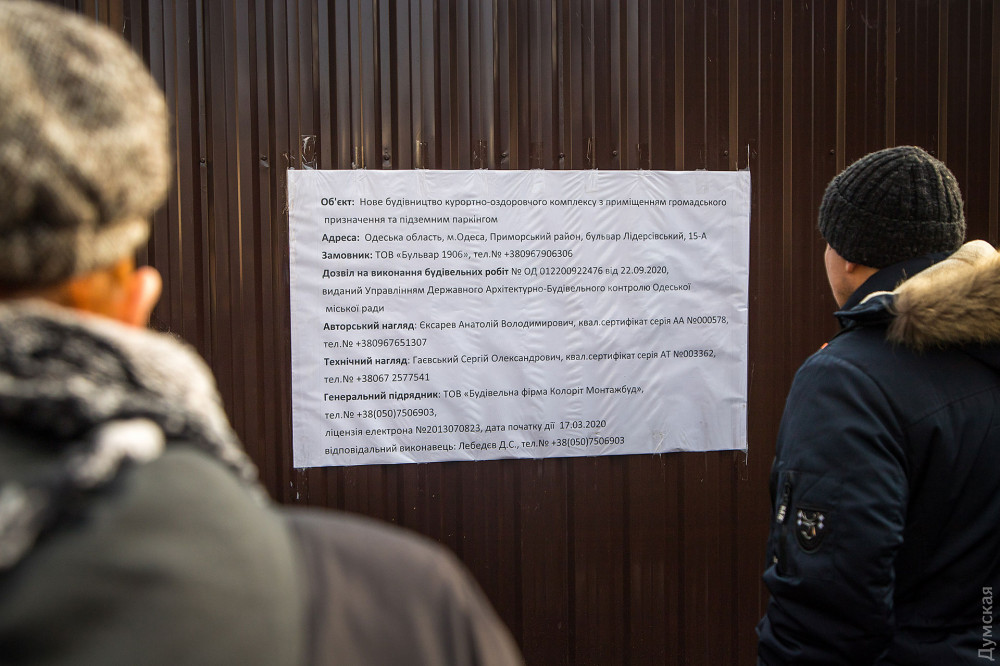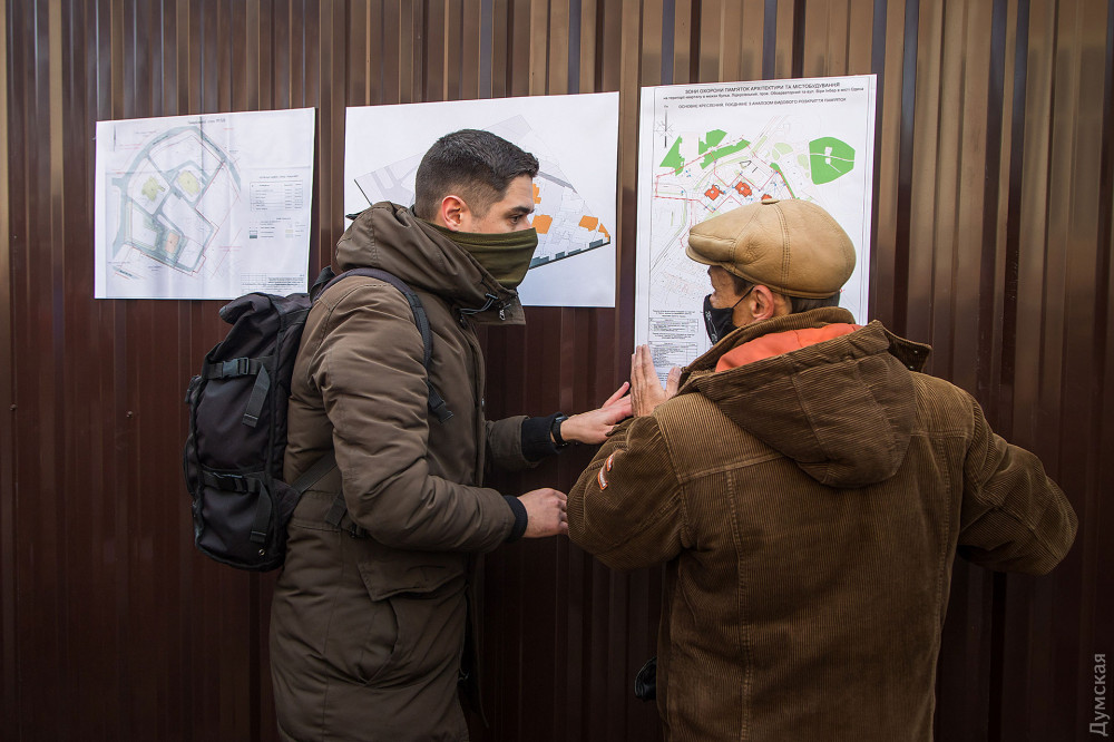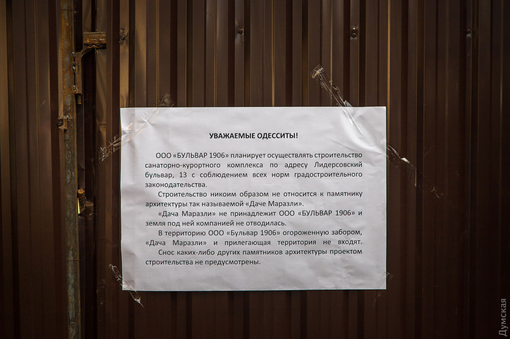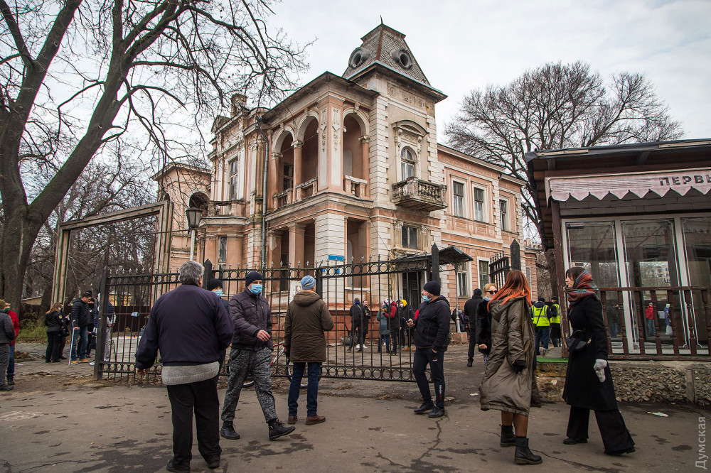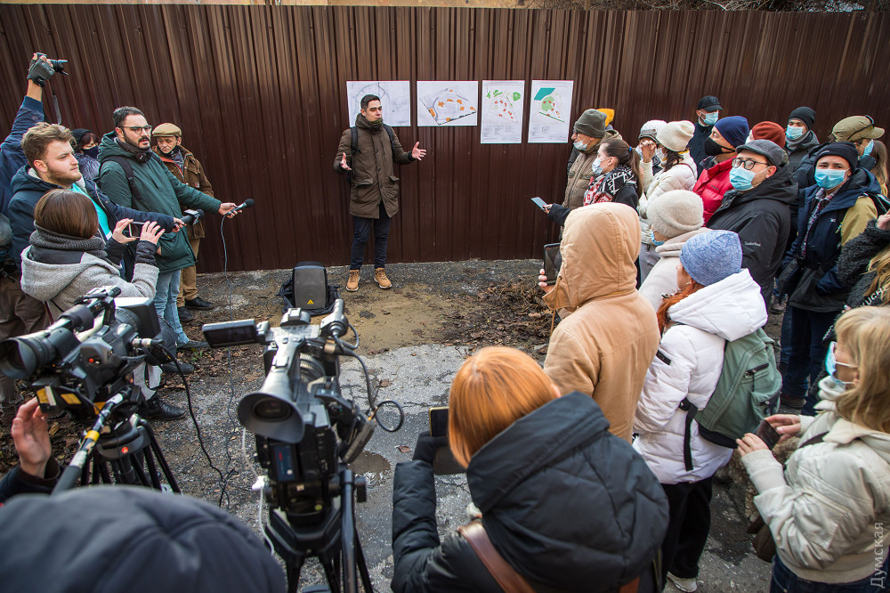 Акция, которая состоялась у стен самого значимого из особняков — Дачи Маразли, принадлежавшей второй жене городского головы, собрала около 200 неравнодушных одесситов. Организаторы митинга вывесили на забор предпроектную документацию, согласно которой на участке вплотную к особнякам будет построено четыре многоквартирных дома.
