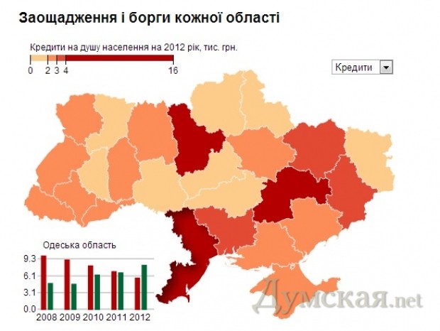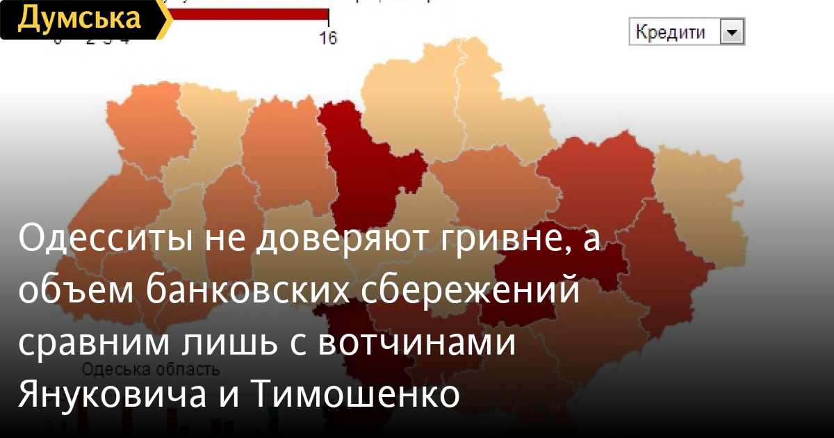 Об этом свидетельствует исследование индекса кредитной зависимости регионов, проведенного Тексты.org.ua. Одесская область заняла третье место со средним показателем сбережений в размере 8302 грн на одного жителя. Впереди оказались только Днепропетровская область (в среднем 9878 грн на жителя) и Донецкой (8151 грн).