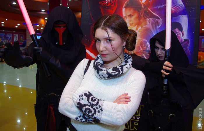 Было их, правда, немного — куда меньше, чем почитателей творчества Толкина на прошлогодней премьере «Хоббита». Проигнорировали премьеру представители Блока Дарта Вейдера — сам Темный лорд, магистр Йода, Император Палпатин и Чубакка. Зато мы встретили принцессу Лею Органу!