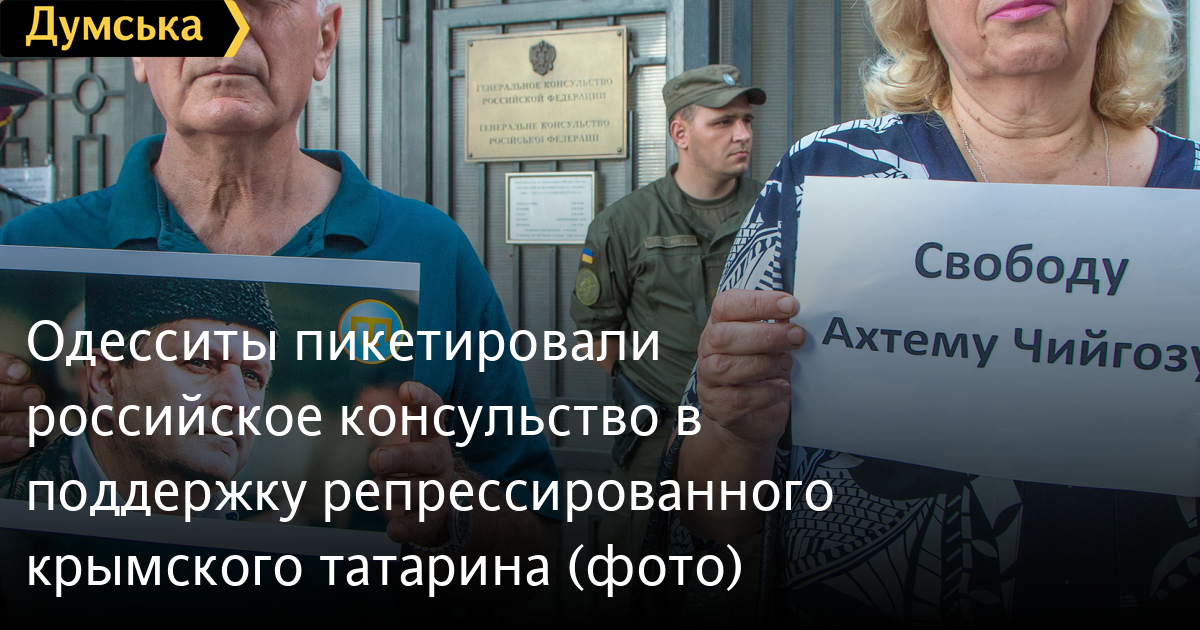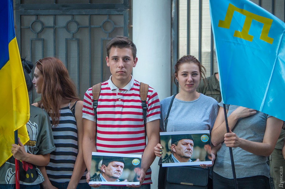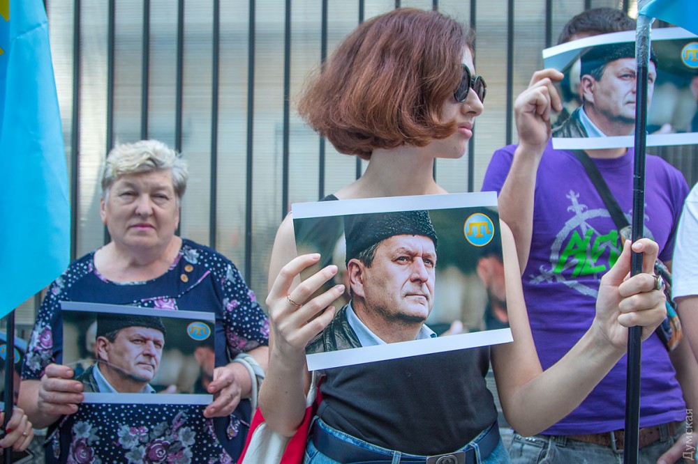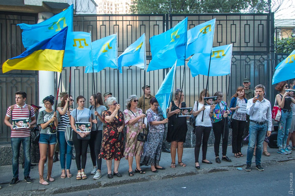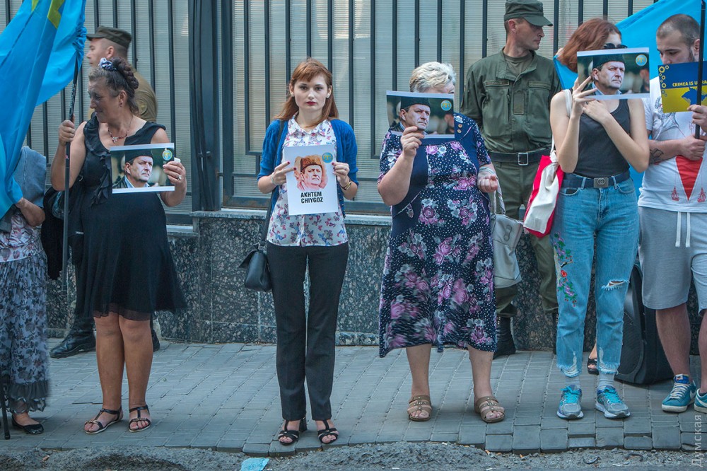 Сегодня вечером у стен российского консульства на Гагаринском плато прошла акция в поддержку заместителя Меджлиса крымскотатарского народа Ахтема Чийгоза, который был отправлен в тюрьму так называемым «верховным судом Крыма».
