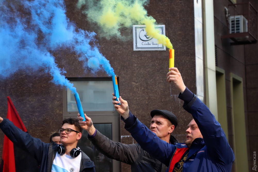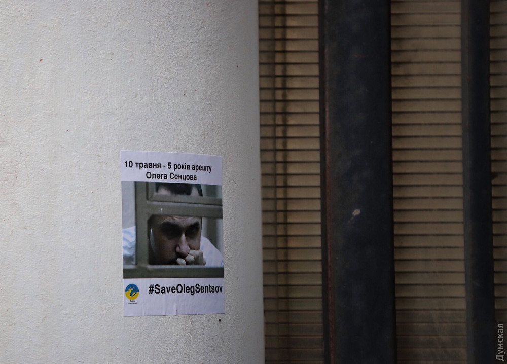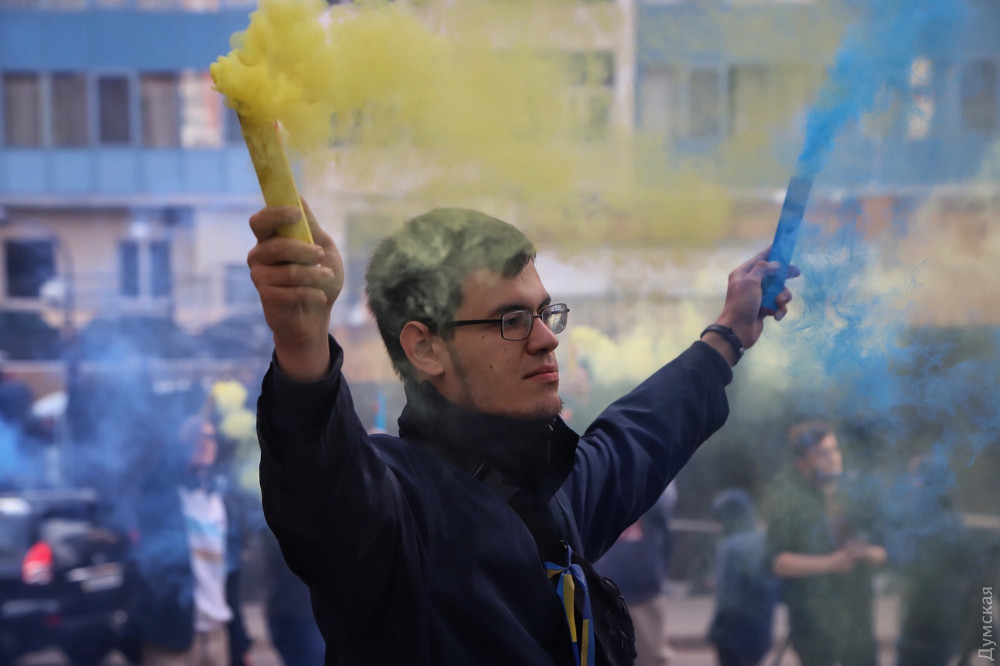 Мероприятие приурочено к пятилетию со дня задержания режиссера. Одесситы обклеили забор наклейками с изображением Сенцова и подожгли фаеры национальных цветов.