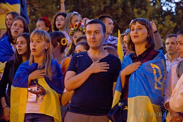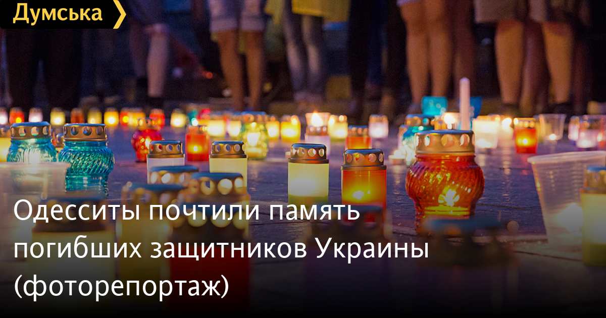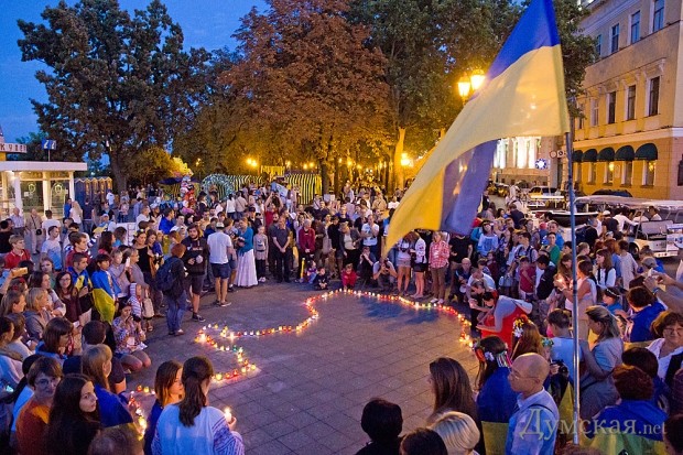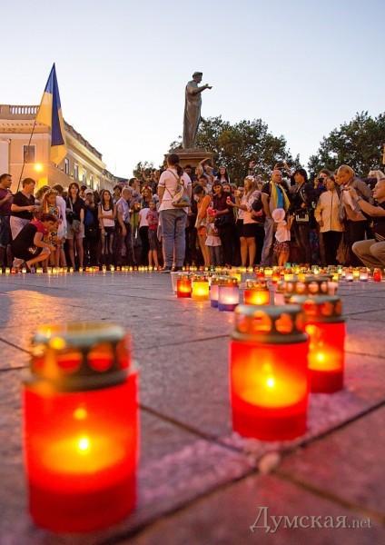 Около двухсот одесситов почтили сегодня память погибших защитников Украины. У памятника Дюку они выложили лампадками и свечами контур нашей страны, после чего была минута молчания.