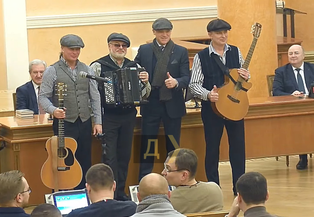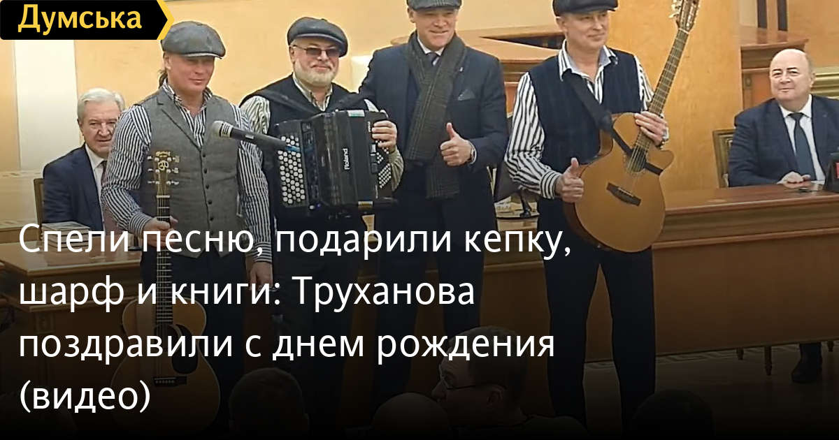 В зал заседаний зашли трое музыкантов во главе с певцом Валентином Кубой, которые исполнили песню «Одессит Мишка», переиначив ее в «Одессита Гену». После они вручили виновнику торжества кепку и шарф.