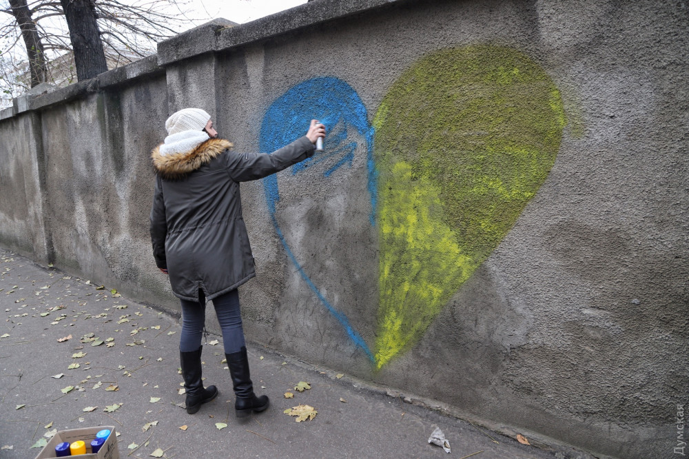 В конце митинга одесситы нарисовали напротив входа в штаб огромное сердце в национальных цветах.