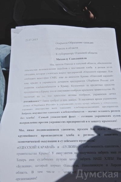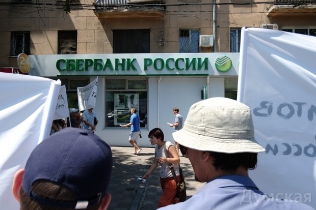 В четверг, 23 июля, под отделением ПАО «Дочерний банк Сбербанка России» прошла акция протеста, в ходе которой собирали подписи под обращением к губернатору. В нем, в частности, отмечается, что одесское предприятие не должно выплачивать долги крымских предприятий.