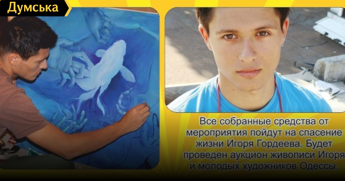 Одесситы проведут благотворительный концерт, чтобы спасти жизнь молодого художника12 сентября в помещении ночного клуба «Итака» состоится тематический вечер по случаю Дня рождения Молодежного совета при Одесском городском голове, в рамках которого пройдет благотворительный концерт «Большое сердце». Как сообщили организаторы, основная цель концерта — собор средств на лечение 22-летнего студента Одесского художественного училища имени Грекова Игоря Гордеева, у которого отказали почки. Для всех гостей будут выступать лучшие музыкальные и вокальные коллективы Одесского региона, а также финалисты «Фабрики звезд». Ведущим мероприятия станет Константин Буржуй. После концерта пройдет благотворительный аукцион, на котором будут продаваться картины, написанные Игорем Гордеевым. Собранные с продажи картин деньги также пойдут на лечение. Начало встречи — в 18:00. Гордеев Игорь Игоревич — инвалид I группы. Инвалидность присвоена в связи с заболеванием почек. Операцию необходимо провести в ближайшее время, так как сейчас Игорь вынужден находиться на гемодиализе. «Раз в два дня по 4,5 часа подключен к аппарату, выполняющему функцию почки. Без этой процедуры жизнь невозможна. Вред, нанесенный токсинами органам и мозгу, сократил сроки на ожидание операции. Собрать нижеследующую сумму для меня невозможно, — говорит парень. — Данная операция не проводится в Украине. Родственников, которые могли бы выступить в качестве доноров не имею, в связи с чем возникает необходимость в проведении операции за пределами территории Украины. Стоимость операции составляет 157 140 у.е. (Медицинский центр Рабин в Израиле)». СМЕРТЬ РОСІЙСЬКИМ ОКУПАНТАМ! Помітили помилку? Виділяйте слова з помилкою та натискайте control-enter |