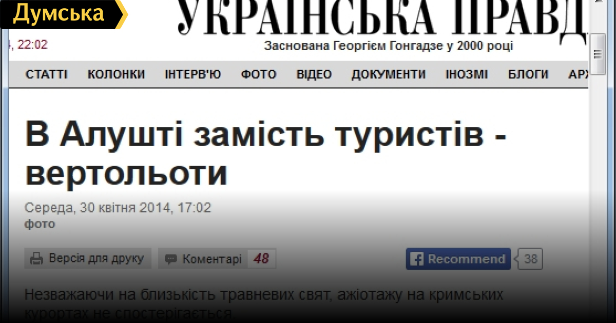 Популярный интернет-ресурс «Украинская правда» опубликовал сегодня новость «В Алуште вместо туристов — вертолеты», в которой сообщается о трудностях курортного сезона на крымских курортах. Трудности эти вызваны политической нестабильностью, оттоком украинских туристов, сложностями транспортного сообщения и относительно невысоким качеством сервиса, который не выдерживает конкуренции с турецкими и средиземноморскими курортами.