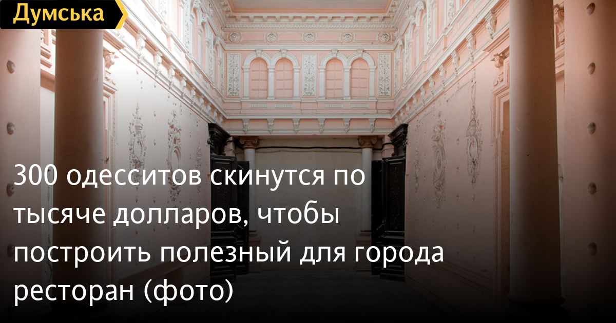 В Одессе планируют создать ресторан, 70% прибыли от которого будет уходить на социально-полезные для города проекты. Заведение под названием «4City» расположится в здании бывшей водолечебницы врачей Семена Рабиновича и Александра Ясиновского, что на Канатной, 27. Основателями ресторана станут 300 одесситов, каждый из которых внесет в бюджет проекта по одной тысяче долларов. Управляющим будет известный одесский ресторатор Alex Cooper.