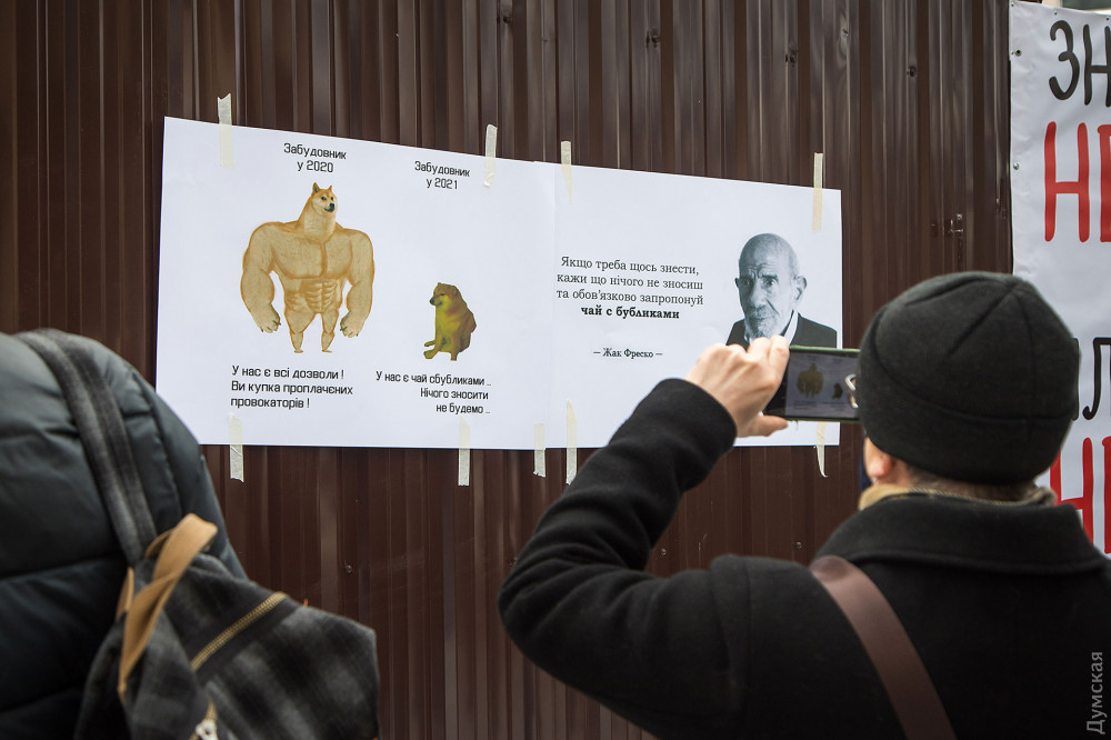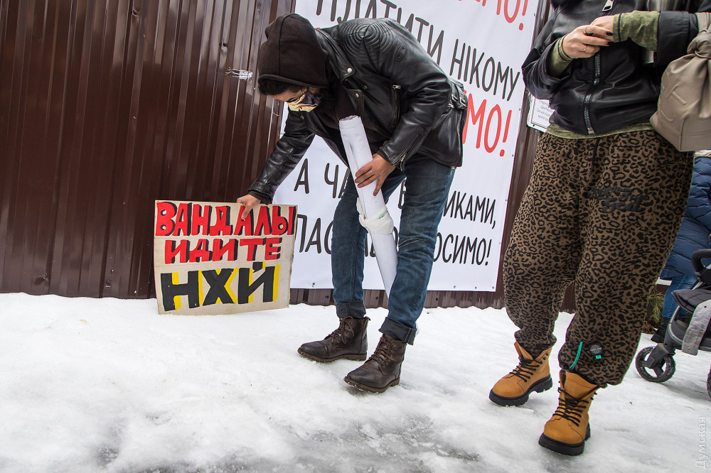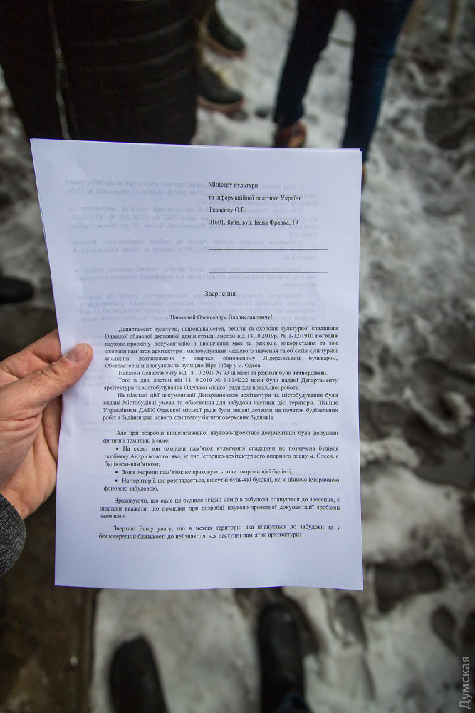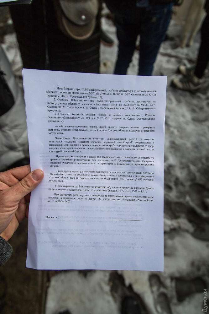 На митинге любой желающий смог высказаться в открытый микрофон и заполнить заявление на имя министра культуры Украины с требованием отменить решение департамента охраны культурного наследия ОГА, которым была утверждена научно-проектная документация с определением границ охранных зон на участке.