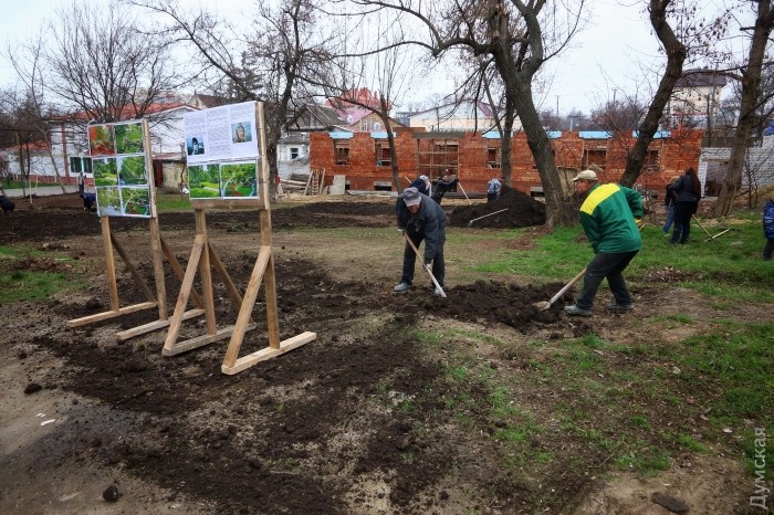 В рамках первого этапа благоустройства одесситы завезли в сквер свежий чернозем и посадили несколько деревьев и розовых кустов.