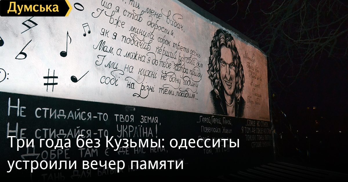 Одесские поклонники творчества Кузьмы Скрябина (Андрея Кузьменко) собрались вечером 2 февраля у стены памяти на Приморском бульваре. Напомним, сегодня исполнилось три года со дня гибели музыканта в ДТП в Днепропетровской области. Акции в память о нем прошли сегодня во многих городах Украины. В Одессе собралось несколько десятков человек. Они слушали песни Скрябина в исполнении коллективов «Две трети», «Николь», и Павла из группы «Free soul». Фото, видео — Андрей Колисниченко СМЕРТЬ РОССИЙСКИМ ОККУПАНТАМ! Заметили ошибку? Выделяйте слова с ошибкой и нажимайте control-enter |