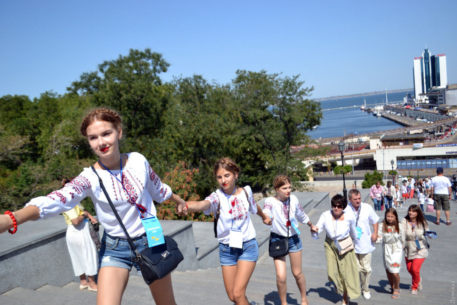 Под песни одесской этно-рок группы «Друже музыко» одесситы в вышивках выстроились на Потемкинской лестнице в две живые цепи и растянули шеренгу по Приморскому бульвару в сторону Воронцовского дворца. Первым нарядили в патриотическую одежду памятник Дюку де Ришелье.