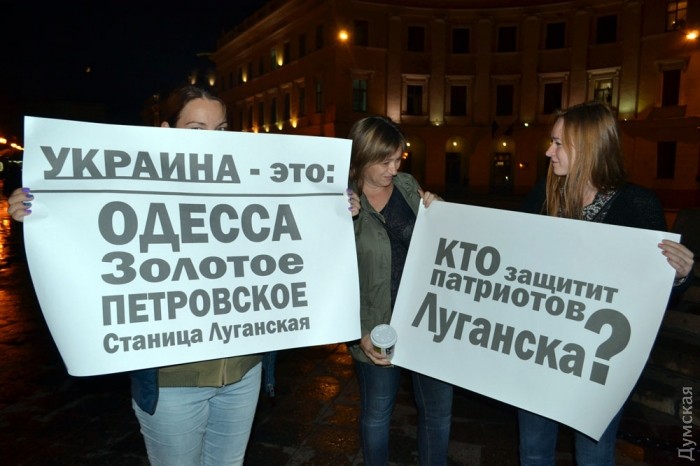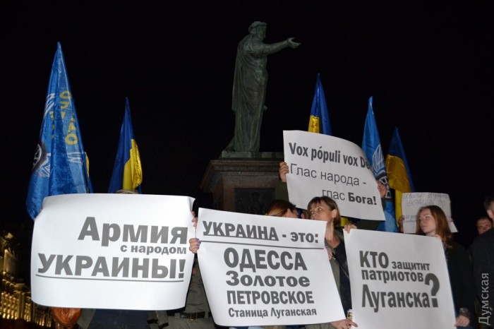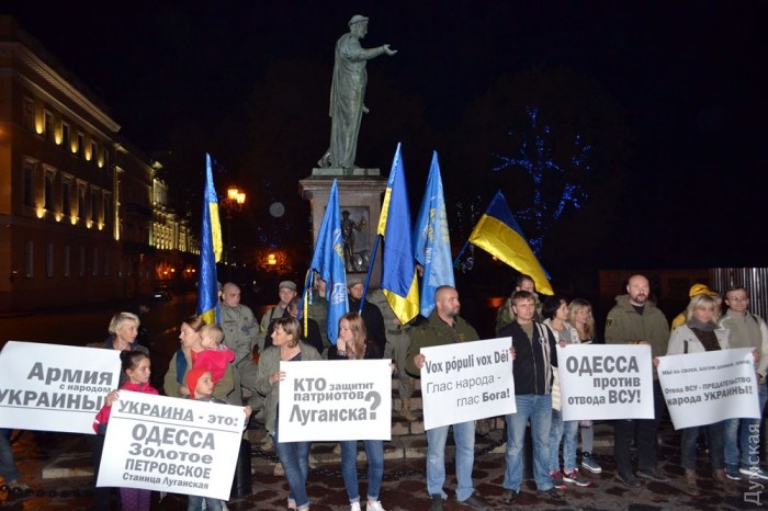 В Одессе несколько десятков активистов патриотических организаций провели акцию в поддержку жителей Станицы Луганской, Золотого и Петровского, которые выступают против отвода украинских войск от этих населенных пунктов.