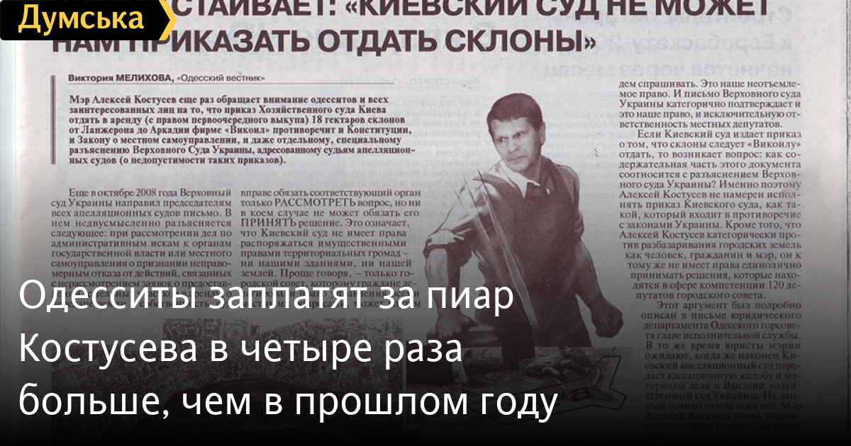 Отметим, что тираж «Одесского вестника» в 2013-м году составит 100 тысяч экземпляров. Столько же, сколько у областного официоза «Одесские известия» — в месяц. При этом типографии «Известия» заплатят всего 925 тыс. грн. Иными словами, за пиар мэра Одессы Костусева (а «Одесский вестник» только им и занимается) мы с вами выложим в три раза больше, чем за прославление «Народного бюджета», деятельности губернатора и политики Виктора Януковича.
