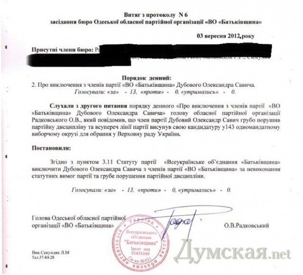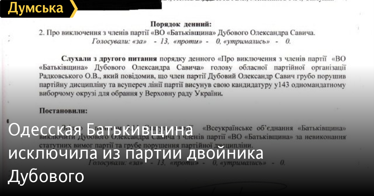ВО «Батькивщина» лишила партбилета Александра Саввовича Дубового, который является кандидатом в народные депутаты по 143-му округу с центром в городе Измаил Одесской области.