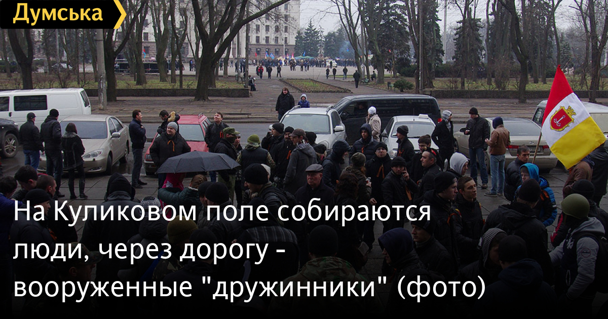 Бойцы вооружены палками и предметами такого же функционального назначения. «Дружинники» ожидают провокаций со стороны «евромайданщиков».