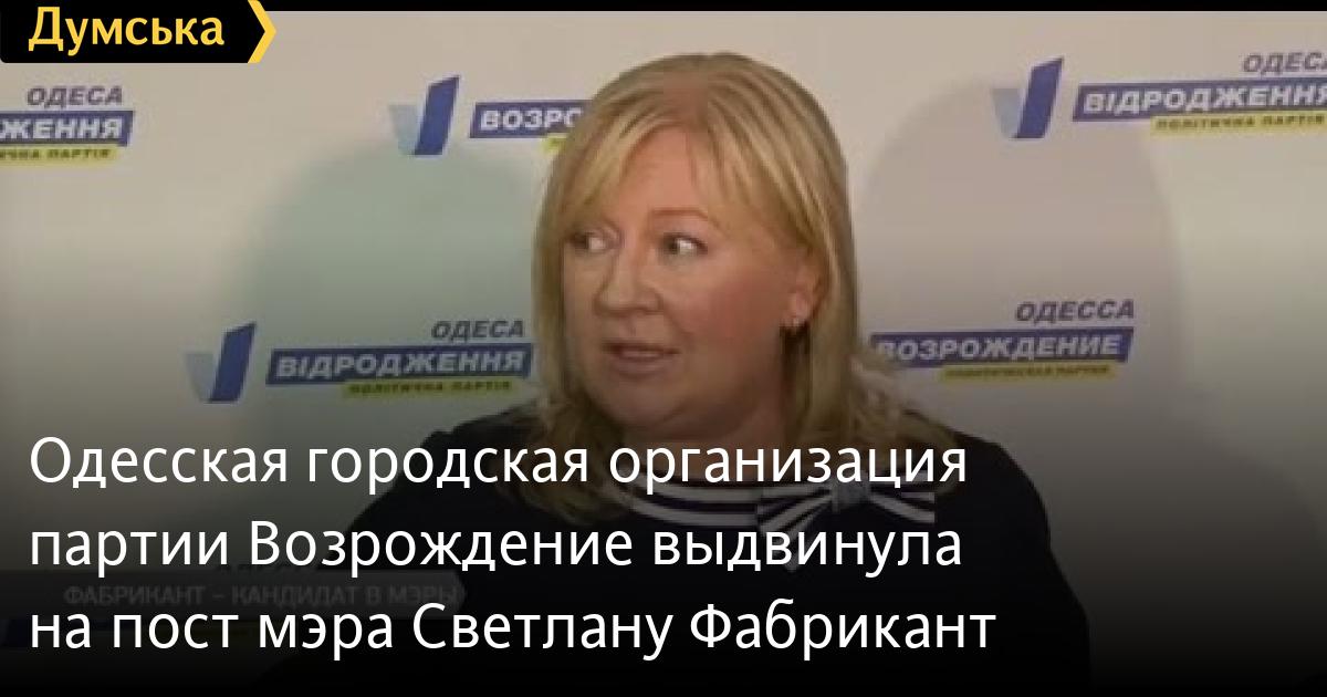 Одесская городская организация партии «Возрождение» выбрала своего кандидата в мэры. Депутаты предлагают назначить на должность Одесского городского головы Светлану Фабрикант.