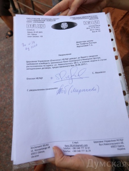 «Пару дней назад пришло письмо с требованием подписать договор напрямую с епископатом, с трехкратным повышением арендной платы, — рассказывает женщина. — Но у нас действующий договор с компанией «Кирхенбау», которая нам сдает помещения, поэтому мы отказались. Сегодня днем я пришла на работу, но в наших кабинетах кто-то ночью поменял все замки. Там находится имущество школы, и теперь я не знаю, сядут ли наши ученики за свои парты первого сентября».