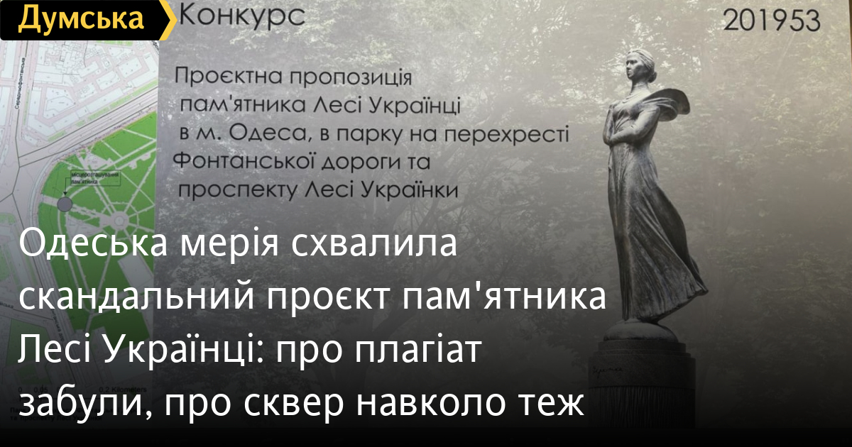 Одеська мерія схвалила скандальний проєкт пам'ятника Лесі Українці: про плагіат забули, про сквер навколо тежПроєктний варіант пам'ятника Лесі Українці, який раніше звинувачували у плагіаті, затвердили в Одеській мерії. Як повідомляє кореспондент «Думської», члени виконкому голосували за таке рішення одноголосно, причому взагалі без обговорення. Ідеться про роботу, яка перемогла у скандальному конкурсі в лютому. Міська влада офіційно закріпила його результати, хоча пам'ятник підозріло нагадує скульптури поетеси 1970-х рр., встановлені в Києві. Процес самого конкурсу приховували від громадськості, а учасники були в нерівних умовах. Крім того, у рішенні виконкому є візуалізація лише самого пам'ятника, як виглядатиме благоустрій навколо — незрозуміло. Хоча в рішенні чітко зазначено: «Затвердити проектну пропозицію для будівництва пам'ятника Лесі Українці в місті Одесі з благоустроєм прилеглої території (додається)». У мерії пояснили, що далі це питання винесуть на сесію.