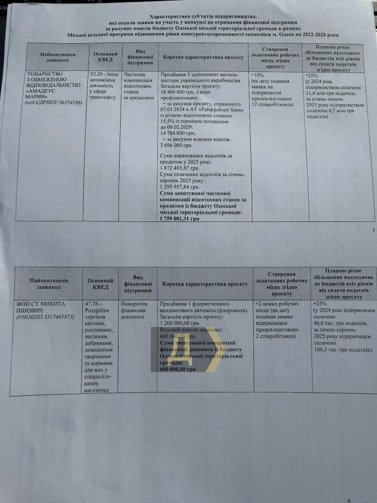 Ветерану – кредит, «лідеру ринку» – подарунок: мерія Одеси підтримає бізнес на 1,2 млн, але є нюансОдеська мерія позичила 600 тисяч гривень ветерану-підприємцю, а «лідеру ринку перевезень наливних вантажів» таку суму подарували. Як передає кореспондент «Думської», гроші дадуть у рамках міської цільової програми підвищення рівня конкурентоспроможності економіки на 2022-2028 роки, ухваленої ще до війни. Заявок на отримання допомоги виявилося лише дві. Перша – ось ТОВ «Амадеус Марін», що просить компенсувати відсотки за кредитом – 1,7 млн грн. безповоротної допомоги. Компанія, яка перевозить агропродукцію, вже має 35 вагонів-цистерн, але хочеться купити ще 5. Для цього й потрібна позика в 18 млн. Іншу заявку подав підприємець-ветеран Микита Пінович, який має сімейний бізнес – квітковий. Колишній військовий має два магазини в Одесі, він попросив у міста 600 тисяч гривень на купівлю флоромату – вендингового автомата для продажу квітів (ми звикли, що у них продають шоколадні батончики та інші снеки). Вніс необхідну суму – отримав букетик. Сам Микита родом зі Львова, але після закінчення вишу живе в Одесі. Микита воював у складі 126 одеської бригади територіальної оборони (сьогодні 39-та окрема бригада берегової оборони ВМСУ). Гроші в обох випадках дадуть у рамках давно прийнятої програми, за якою бізнес може отримувати допомогу. Зазвичай до мерії звертаються фопи та невеликі компанії. Члени комісії більше часу розглядали заявки та з великою симпатією поставилися до ініціативи Микити Піновича. Йому виділили йому 600 тисяч гривень за умови, що за два роки він поверне городу цю суму. Депутат міськради Олег Звягін запропонував 600 тисяч гривень повернути до бюджету, оскільки це втричі менше за те, що запросив «Амадеус марин». Голова комісії Ганна Позднякова запропонувала проголосувати за три варіанти розвитку подій, проте першою поставила на голосування той, який передбачає дати 600 тисяч ветерану-флористу та компанії, яка позиціює себе як «лідер ринку перевезень наливних вантажів». Та й важлива відмінність – «лідер ринку» 600 тис. гривень отримає просто так, повертати гроші не треба. Позднякова першою підняла руку, щоби фактично подарувати гроші перевізникам агропродукції, за нею потягнулися й інші члени комісії. «Я та Василь Єремія були проти того, щоб давати такі подарунки приватній компанії з доходом у 200 мільйонів гривень, але більшістю голосів інші депутати та чиновники підтримали виділення 600 тис. грн. Тільки позавчора ми слухали як важко нашому бюджету і скільки потрібно грошей, а тут фактично спонсоруємо прибуткову приватну компанію», — зазначив Олег Звягін. СМЕРТЬ РОСІЙСЬКИМ ОКУПАНТАМ! Помітили помилку? Виділяйте слова з помилкою та натискайте control-enter |