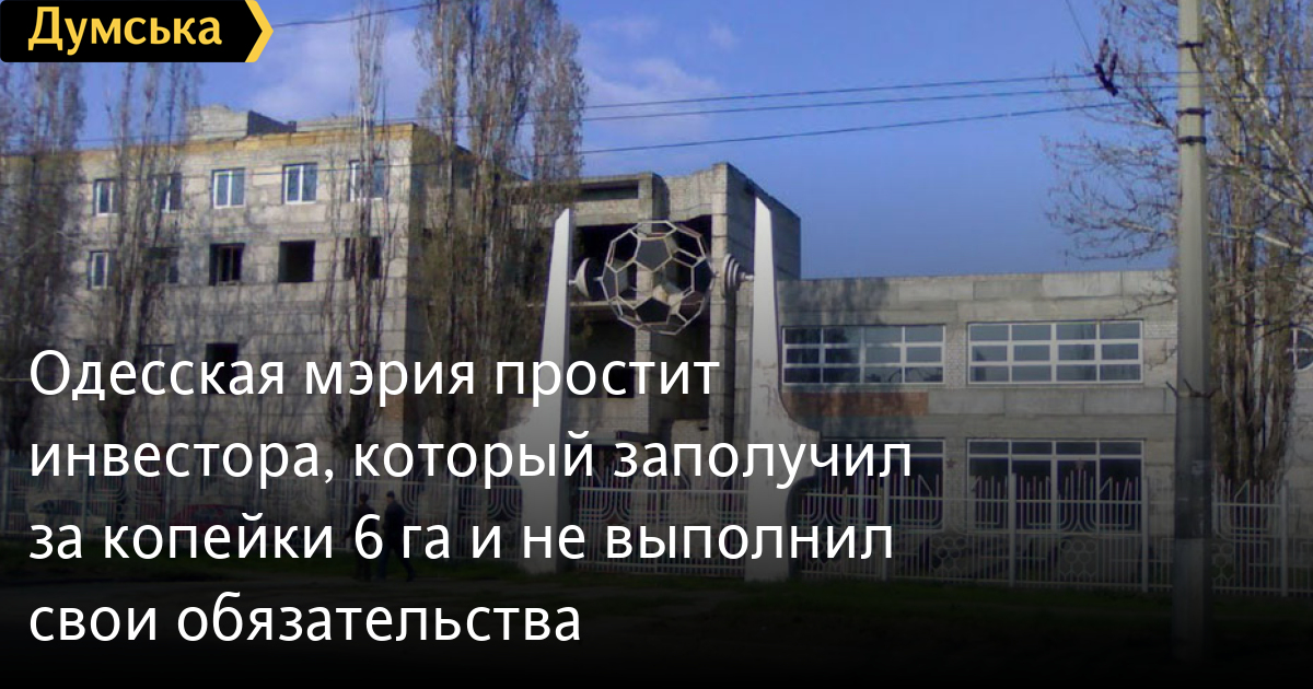 Семь лет назад спорткомплекс, который расположен на участке площадью 5 гектаров, был передан по заниженной цене компании «Лада Экспорт». Фирма взяла на себя обязательство построить новый стадион, за что ей установили льготную ставку аренды земли – около 400 тыс грн в год вместо положенных 3 млн. Работы, однако, не начались до сих пор.