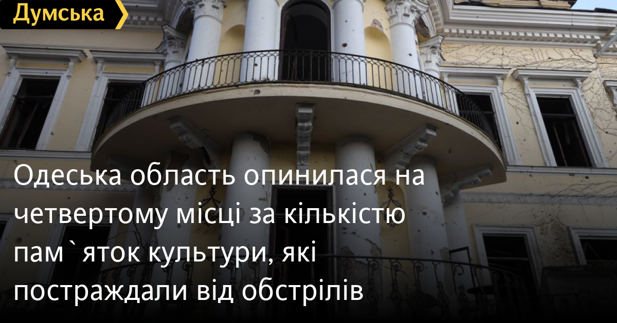 На четвертому місці в Україні опинилася Одеська область за кількістю культурних пам'яток, які постраждали внаслідок обстрілів окупантів. Таких у регіоні зараз 116.