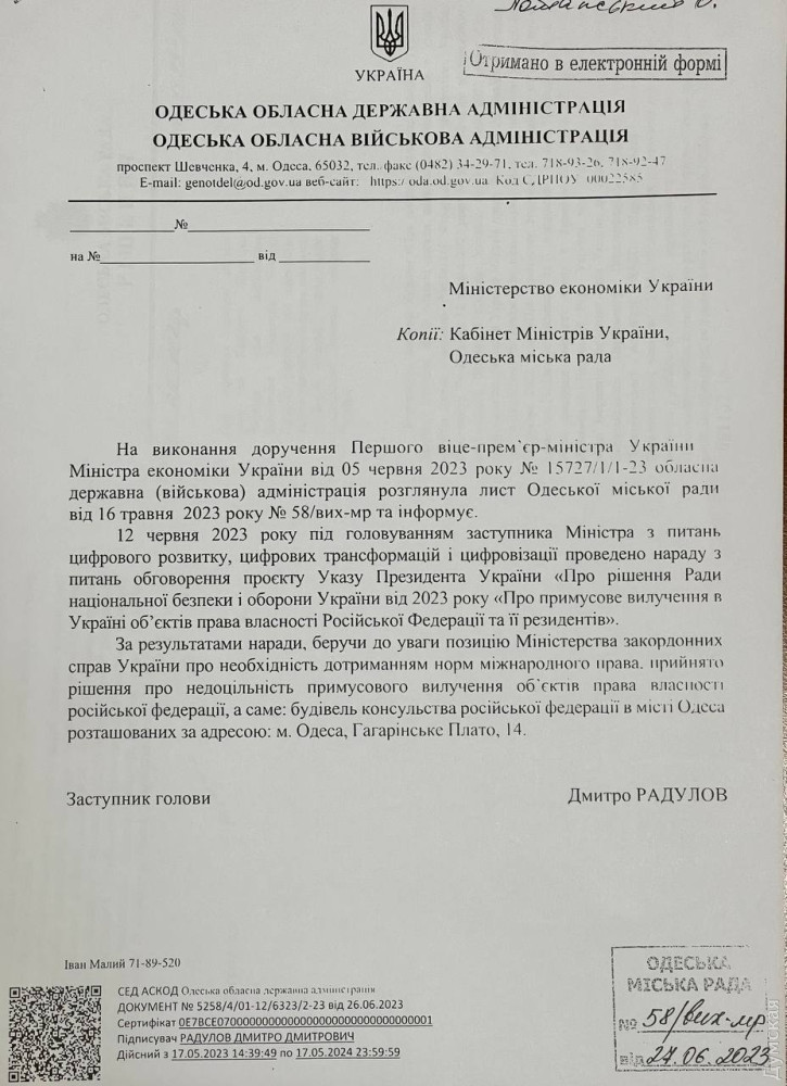 Одеська обласна державна адміністрація вважає «недоцільною» націоналізацію будівлі російського консульства на Гагарінському плато.