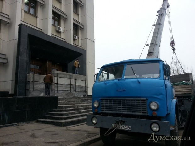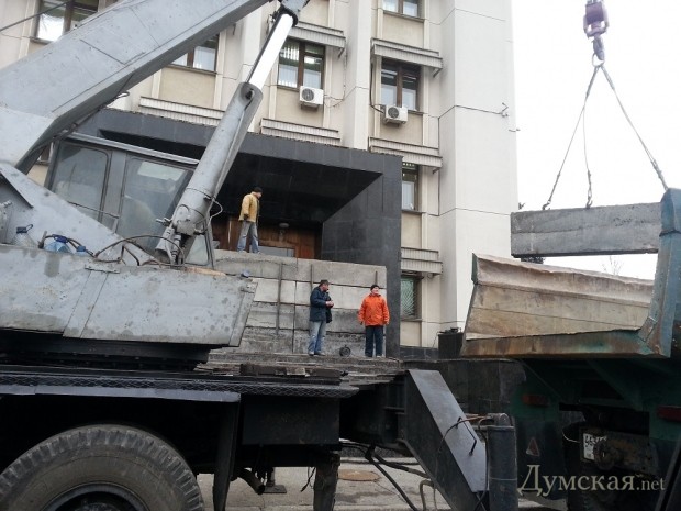 Сегодня утром рабочие приступили к демонтажу бетонных баррикад, которые перекрывали задние входы в здание областной государственной администрации.