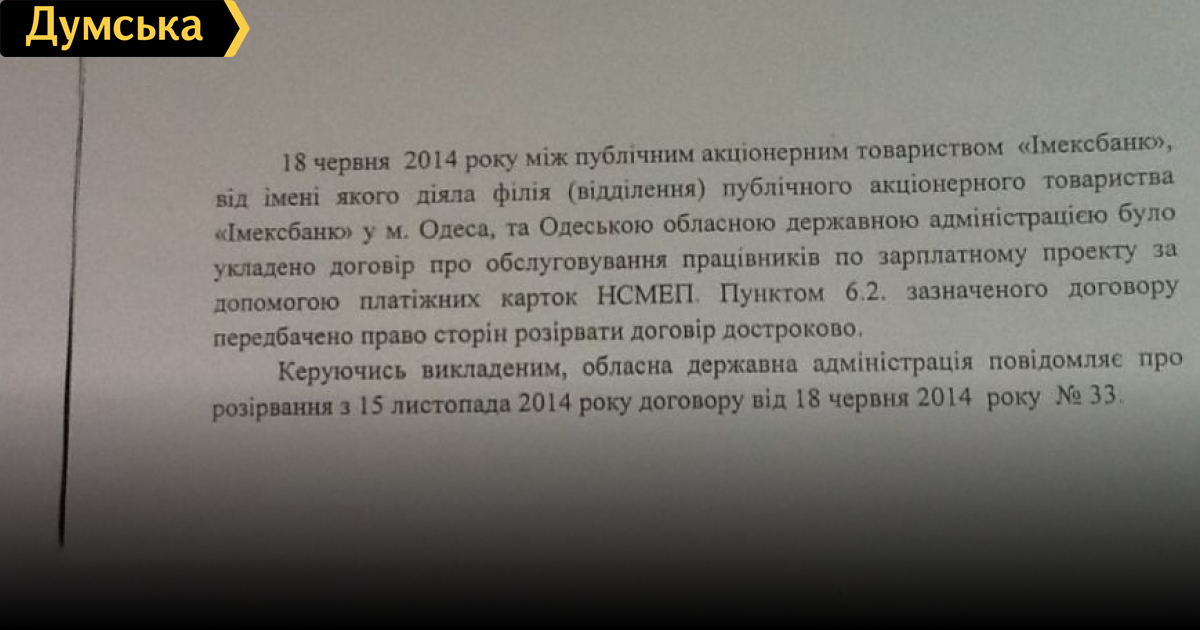 Игорь Палица закрыл счета работников Одесской облгосадминистрации в «Имексбанке». Сайт «048» опубликовал документ, согласно которому с 15 ноября будет прекращен договор на перечисление зарплаты через банк Леонида Климова. Договор расторгается досрочно — в связи с распоряжением с распоряжением Кабинета Министров Украины, согласно которому государственные органы власти обязаны вести расчеты через государственные «Ощадбанк» и «Эксимбанк». Отметим, что областная администрация сотрудничает с «Имэксбанком» почти полтора десятилетия. СМЕРТЬ РОСІЙСЬКИМ ОКУПАНТАМ! Помітили помилку? Виділяйте слова з помилкою та натискайте control-enter