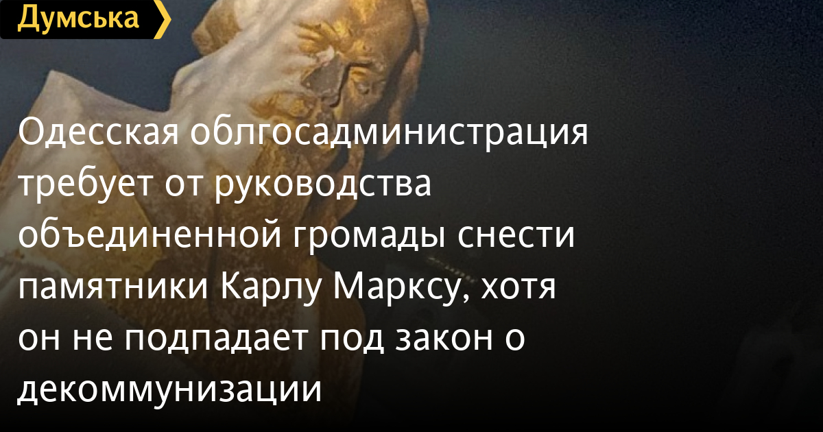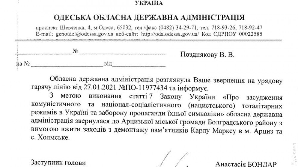 Одесская областная государственная администрация обратилась к Арцизской городской объединенной территориальной громаде с требованием демонтировать памятники немецкому философу, экономисту и коммунистическому деятелю Карлу Марксу, расположенные в самом Арцизе и селе Холмское, которое входит в состав ОТГ.