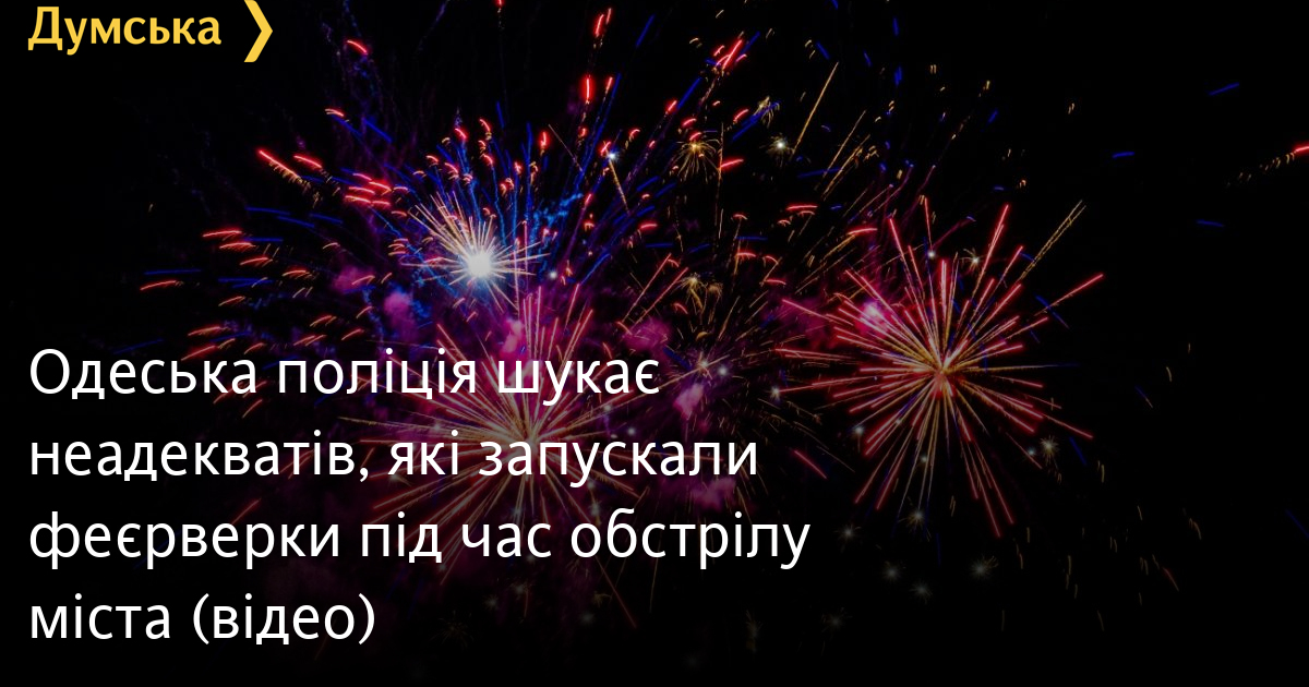 Одеська поліція шукає неадекватів, які запускали феєрверки під час обстрілу міста (відео)Осіб, які під час обстрілу Одеси ввечері 31 січня запускали феєрверки, встановлює одеська поліція. Як повідомили у пресслужбі відомства, подія трапилася в Київському районі міста. Один феєрверк запустили просто під час повітряної тривоги, а другий — після відбою. Правоохоронці опитують очевидців і встановлюють особи «веселунів». Помітили помилку? Виділяйте слова з помилкою та натискайте control-enter |