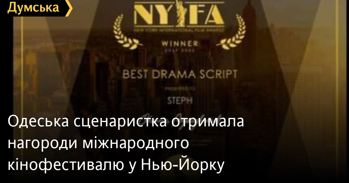 Одеська сценаристка отримала нагороди міжнародного кінофестивалю у Нью-ЙоркуОдеська сценаристка та письменниця Ксенія Заставська відзначена нагородами міжнародного кінофестивалю у Нью-Йорку. Як повідомляє пресслужба Одеської міської ради, представлений одеситкою сценарій «Стеф» переміг одразу у двох номінаціях. Ксенія Заставська бере активну участь у культурному житті міста, входить до складу робочої групи з питань розвитку кіно при Одеській міській раді. СМЕРТЬ РОСІЙСЬКИМ ОКУПАНТАМ! Помітили помилку? Виділяйте слова з помилкою та натискайте control-enter |
