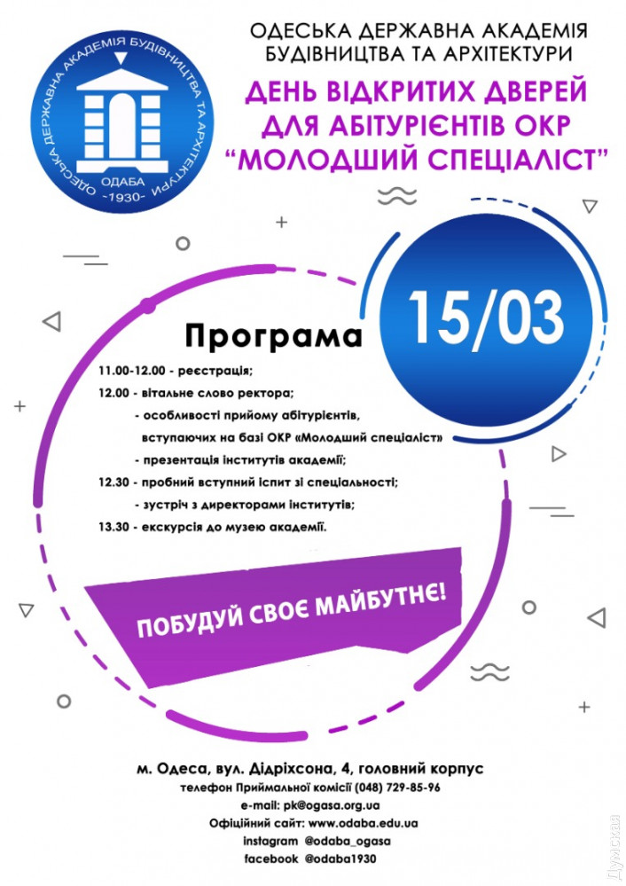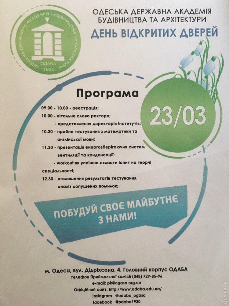 15 и 23 марта в ведущем одесском вузе — Одесской государственной академии строительства и архитектуры — пройдут дни открытых дверей. Так, 15 марта альма-матер лучших архитекторов страны ждет в гости младших специалистов. Выпускники колледжей и техникумов смогут узнать особенности приема абитуриентов и попробовать свои силы в тренировочном вступительном экзамене. В этот день все институты вуза выступят с презентациями. Кроме того, откроет свои двери уникальный музей академии. В субботу, 23 марта, академия строительства и архитектуры открывает двери для школьников, желающих связать свое будущее с одной из самых перспективных профессий. СМЕРТЬ РОСІЙСЬКИМ ОКУПАНТАМ! Помітили помилку? Виділяйте слова з помилкою та натискайте control-enter |