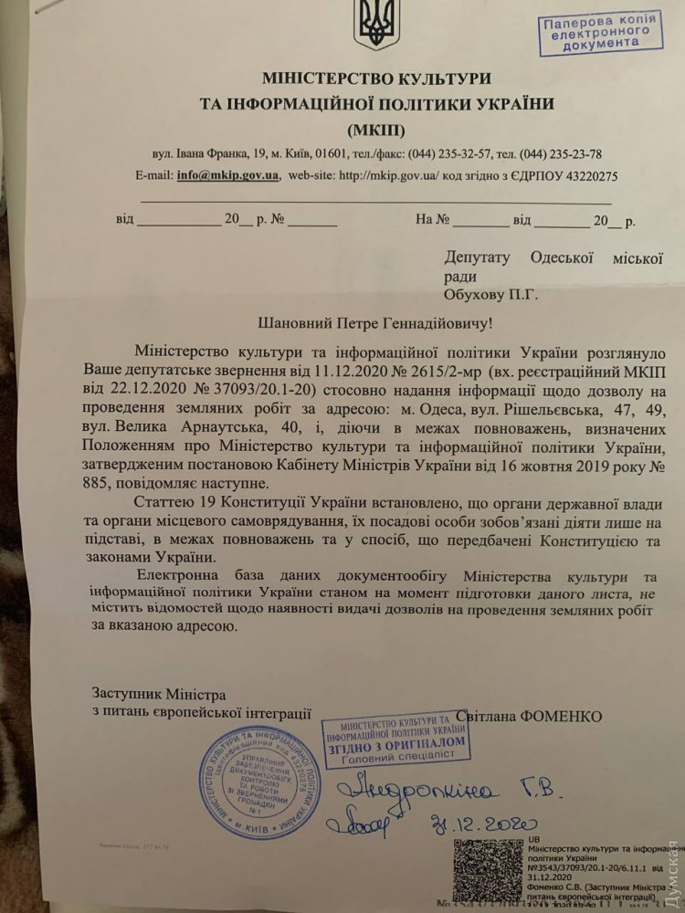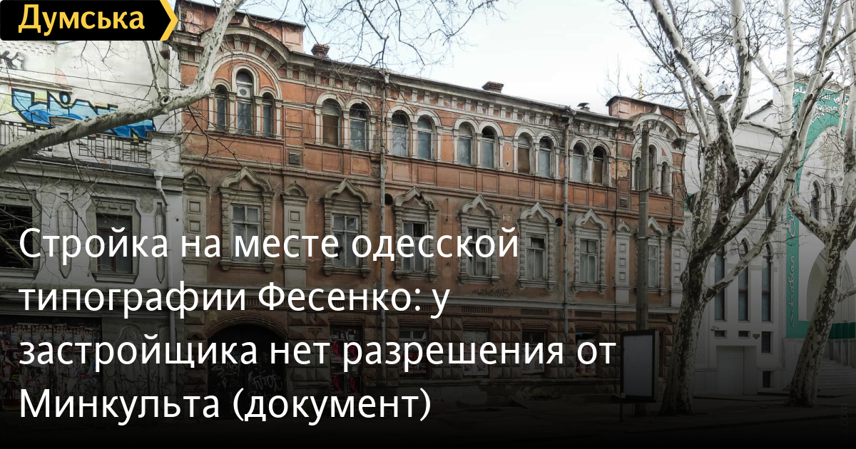Стройка на месте одесской типографии Фесенко: у застройщика нет разрешения от Минкульта (документ)История с высотной застройкой в центре Одессы на месте известной типографии Ефима Фесенко на Ришельевской, 47 обрастает новыми подробностями. Как стало известно «Думской», застройщик — компания «Одеса-Сіті», не согласовал с Министерством культуры и информационной политики свой проект в историческом ареале нашего города. Об этом сообщил депутат городского совета от партии «Европейская Солидарность» Петр Обухов, который подал запрос в Киев и получил на него ответ. «Участок находится в границах комплексной охранной зоны центрального исторического ареала. И по закону застройщик обязан получить разрешение на строительные работы в Минкульте. Есть ли это разрешение – неизвестно, нужно сделать запрос», — цитирует ответ Минкульта депутат. Таким образом, как подчеркнул Обухов, разрешения от министерства на строительные работы у застройщика пока нет. Учредителем «Одеса-Сіті» выступает офшорная компания «УППА ФАЙНЕНС ЛТД», которой управляют Вадим Шульман из Израиля и житель Одессы Александр Друмов. Директор — Евгений Суворов. Фирма входит в состав группы «Рост», которую связывают с мэром Геннадием Трухановым. Дом №47 на Ришельевской улице построили в 1841 году, а в 1891 реконструировали под типографию Ефима Фесенко. На сегодняшний день объект утратил охранный статус, как и расположенный по соседству Ришельевский театр (бывший кинотеатр имени Короленко). Рядом с будущей стройкой находится еще один памятник архитектуры — дом Нолле 1901 года постройки. Уроженец Черниговщины и житель Одессы Ефим Фесенко сделал значительный вклад в развитие украинской культуры. Когда в Российской империи действовали запреты на использование украинского языка (Валуевский циркуляр, Эмский указ и другие акты), он издавал иконы, лубочные картины в национальном стиле, листовки с текстами народных песен и нотами, а также книги этнографичски-бытового содержания и художественную литературу, в том числе произведения Тараса Шевченко. Это формально не запрещалось, но такая деятельность и не поощрялась царскими властями. После публикаций в СМИ и протестов, застройщик переделал проект фасада и изменил проектное решение новой «стекляшки» на Ришельевской, но сути это не меняет — в столице еще подумают над застройкой исторического ареала Одессы. СМЕРТЬ РОСІЙСЬКИМ ОКУПАНТАМ! Помітили помилку? Виділяйте слова з помилкою та натискайте control-enter