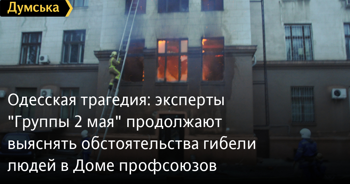 Так, по предварительным сведениям, имеющимся в распоряжении «Группы 2 мая», у некоторых погибших были обнаружены частицы копоти в дыхательных путях, а некоторые погибли в результате ожога органов дыхания. Это обстоятельство однозначно исключает слухи о том, что пострадавшие были мертвы задолго до событий или погибли в результате взрыва, который якобы вызвал пожар в здании.