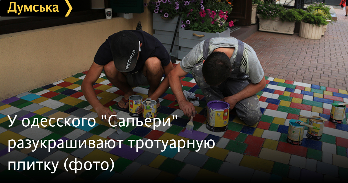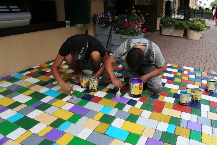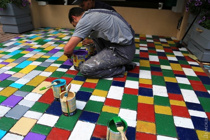 Как передает корреспондент «Думской», два молодых человека раскрашивают плитку в разные цвета. Говорят, это для украшения города и привлечения клиентуры.