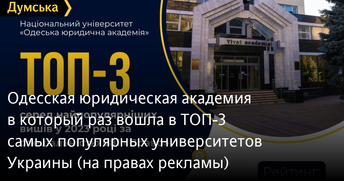Одеська юридична академія вкотре увійшла до ТОП-3 найпопулярніших університетів України (на правах реклами)Національний університет «Одеська юридична академія» вкотре увійшов у ТОП-3 найпопулярніших університетів України. Це єдиний навчальний заклад, який представив Одесу в рейтингу «081 ПРАВО: 10 найпопулярніших вишів» від Вступ 2024 Live. Рейтинг базується на кількості поданих заяв на бакалаврат у 2023 році. За даними рейтингу, Одеська юридична академія отримала такі показники: - загальна кількість поданих заяв: 2 464; - кількість заяв на бюджетні місця: 1 504; - середній конкурсний бал абітурієнтів: 155,6. «Успіх НУ «ОЮА» свідчить про стабільно високий інтерес та перспективність юридичної освіти в південному регіоні, а також конкурентоспроможність випускників університету на ринку праці», — розповіли у виші. Помітили помилку? Виділяйте слова з помилкою та натискайте control-enter |