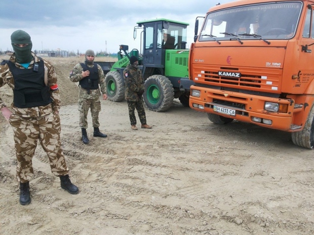 На территории ландшафтного парка «Тилигульский» общественники вместе с активистами патриотических организаций задержали технику, которая, по их мнению, использовалась для незаконной добычи песка.