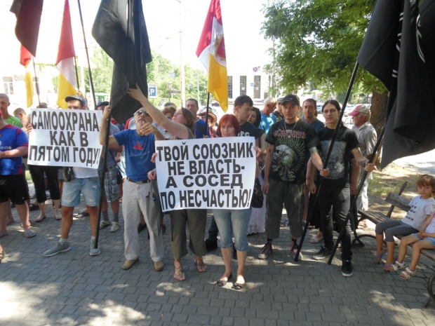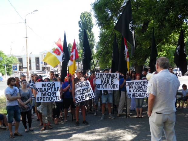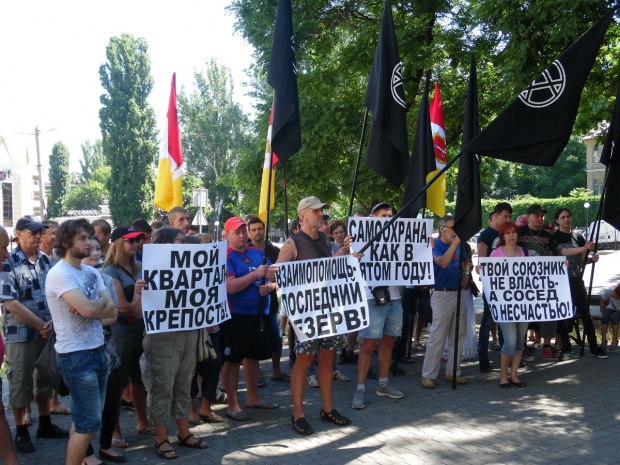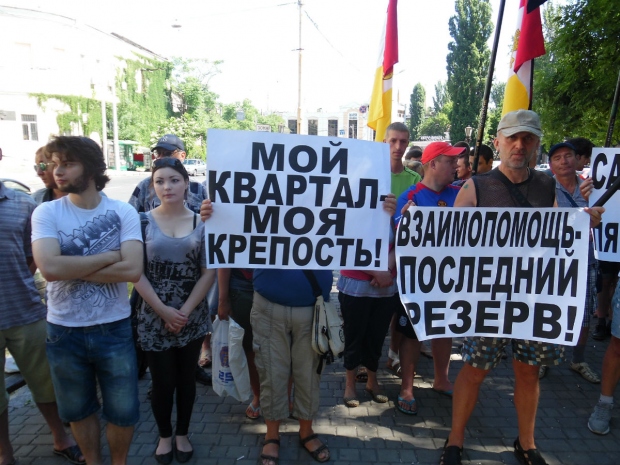 Участники митинга держали плакаты и скандировали лозунги: «Мой квартал – моя крепость!», «Взаимопомощь – последний ресурс!», «Самоохрана, как в пятом году!» и «Твой союзник – не власть, а сосед по несчастью!».
