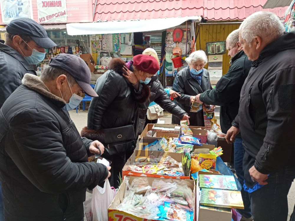 Привоз накануне праздников пестрит и радует глаз обилием товара и покупателей. Большинство людей на базаре без защитных масок или с приспущенными на подбородок.