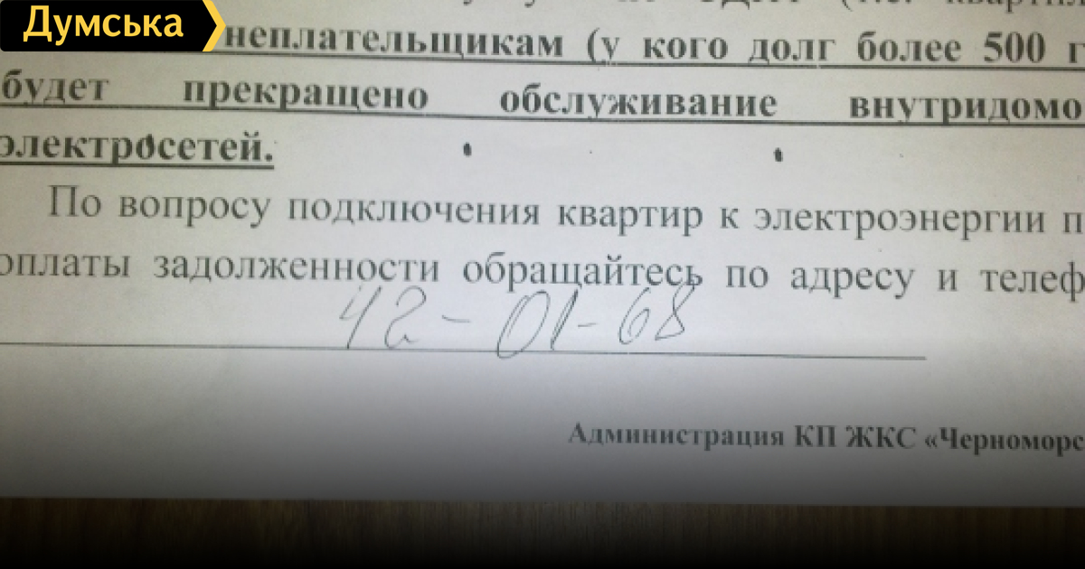 Вот такие объявления появились в парадных домов, которые обслуживает ЖКС «Черноморский». Злостным неплательщикам СДПТ угрожают отключением света. Редакция «Думской» напоминает руководству коммунального предприятия, что поставка электроэнергии производится на основании Правил пользования электроэнергией для населения и типовых двусторонних договоров между потребителем и поставщиком (в данном случае — «Одессаобэнерго»). Эти Правила и договоры четко прописывают основания для отключения — отказ платить за электроэнергию (т.е. по счетчику в РЭС) в течение 30 дней после предупреждения, которое подается через 20 дней после просрочки даты оплаты. Ни о какой оплате СДПТ действующие нормативы даже не упоминают. Более того, пока еще действующие тарифы СДПТ для ЖКС «Черноморский», утвержденные скандальным решением исполкома, содержат п. 8 «Технічне обслуговування внутнішньобудинкових систем тепло-, водопостачання, водовідведення і зливної каналізації, несучих та захисних конструкцій, столярних виробів». Плату за обслуживание внутридомовых сетей электроснабжения и газоснабжения тарифы СДПТ не предусматривают. В целом ситуация напоминает эпизод классической советской комедии: «А не будут брать — отключим газ!» Между тем, статья 186 Кодекса Украины об административных правонарушениях предусматривает ответственность за самоуправство, то есть самовольное, вопреки установленного законом порядка, осуществление своего законного или выдуманного права. Если такие действия повлекут тяжелые последствия — они будут квалифицироваться уже по уголовному кодексу. СМЕРТЬ РОСІЙСЬКИМ ОКУПАНТАМ! Помітили помилку? Виділяйте слова з помилкою та натискайте control-enter Новини по цій темі: 6 липня 2023: До кінця війни вода дорожчати не буде, - Шмигаль 3 липня 2023: Вода не подорожчає: нацрегулятор скасував власне рішення 30 червня 2023: З першого липня одесити більше платитимуть за воду 23 червня 2023: Мерія Одеси готується знову затвердити підвищені тарифи на паркування в місті: раніше їх скасував суд 16 березня 2023: В Одесі знову подорожчає вода: у два етапи |
