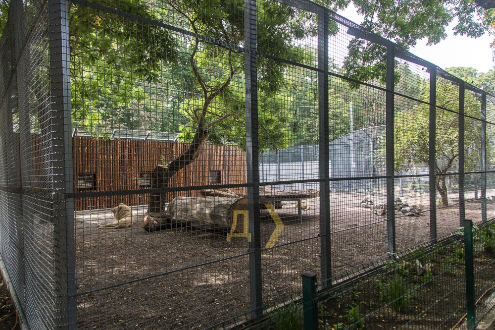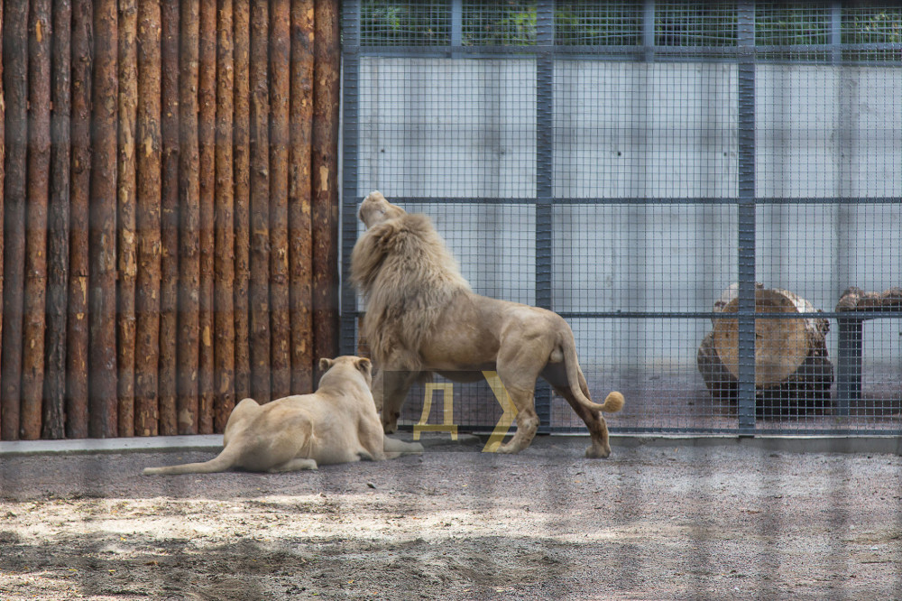 Як повідомляє кореспондент «Думської», евакуйованій з Харкова парі білих левів дістався великий вольєр, два молоді одеські самці задовольняються малим, який все одно більше за їх колишню житло-клітку раз в десять.
