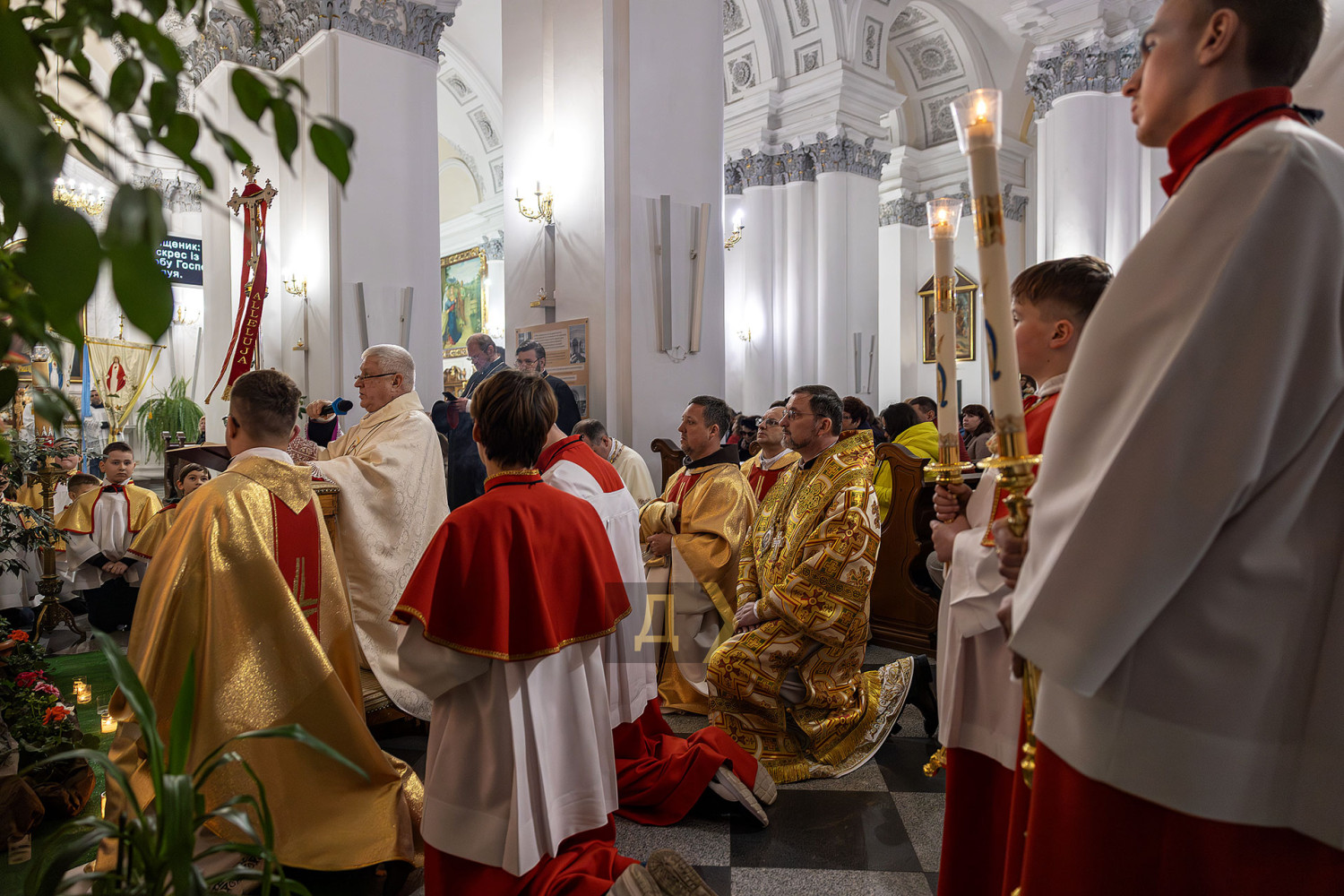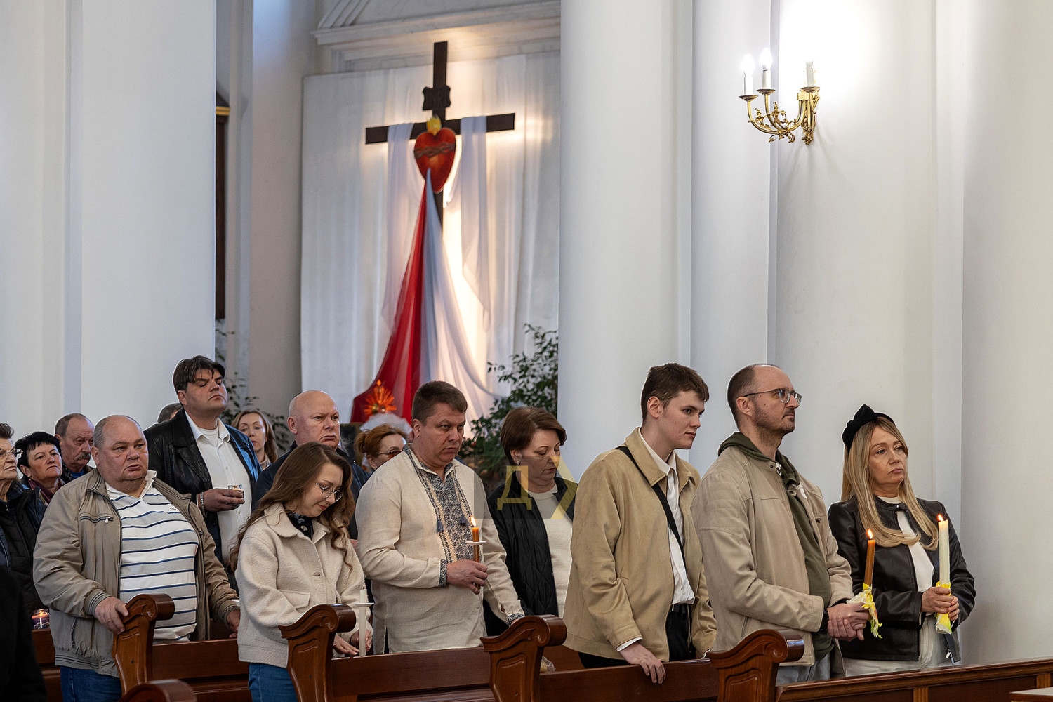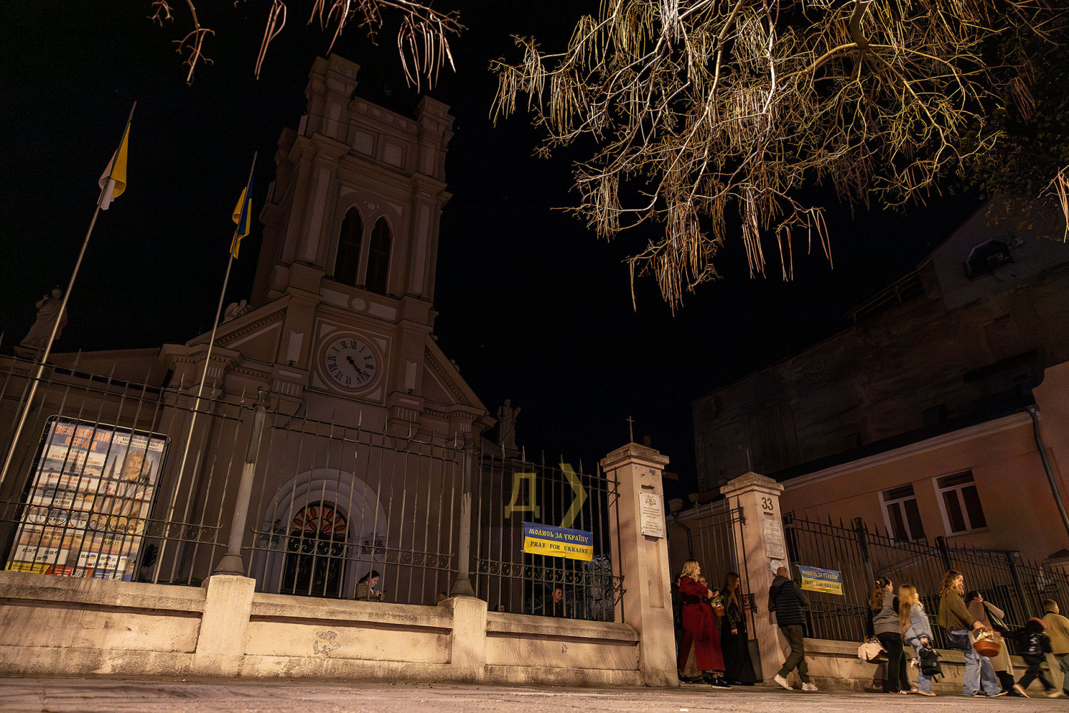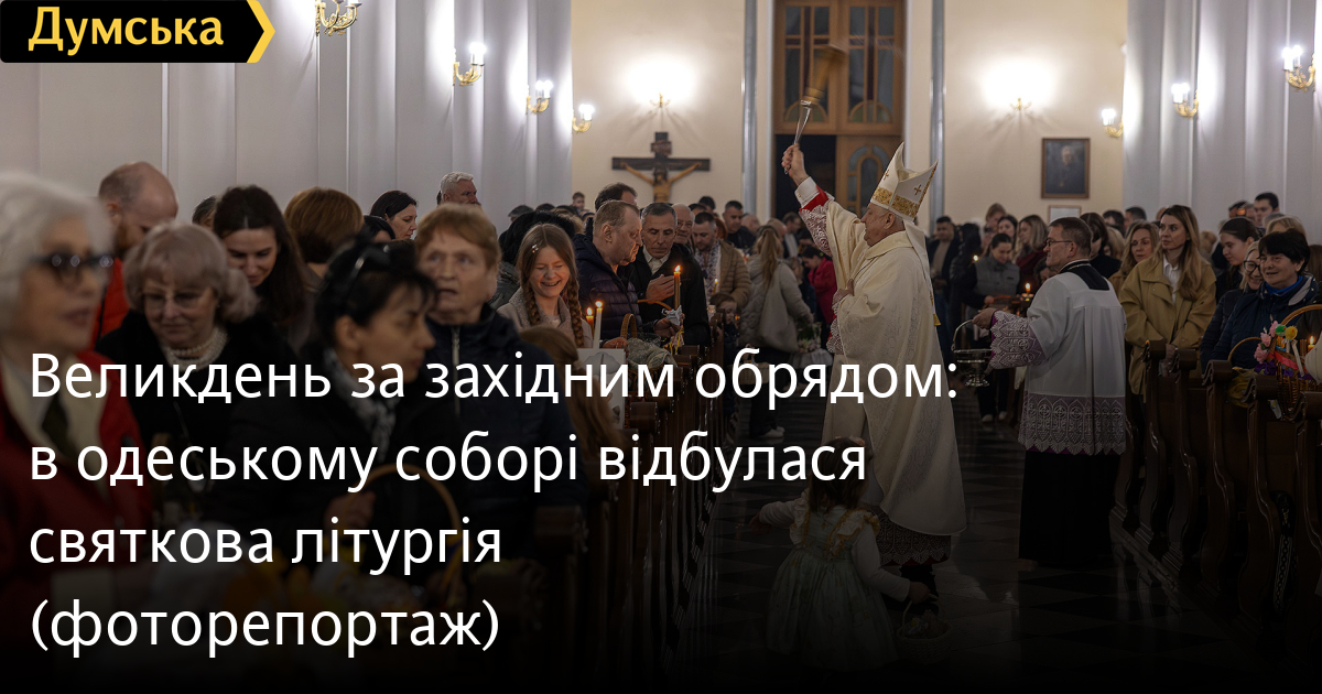 Воскресіння Христове відзначають сьогодні одеські римо-католики та частина протестантів. Кореспондент «Думської» напередодні відвідав вечірню літургію в кафедральному соборі Успіння Пресвятої Богородиці Діви Марії на Європейській вулиці. Богослужіння зібрало сотні парафіян. Перед входом до храму традиційно встановили величезний каркас у вигляді яйця, куди кожен може повісити свою писанку.