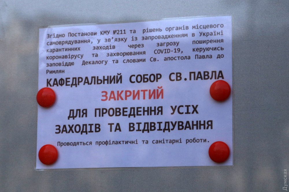 Одесские лютеране также отмечают светлое Воскресение, но их главная обитель — Собор Святого Павла (Кирха) временно закрыт. Объявление у входа гласит, что там проводятся санитарные мероприятия.